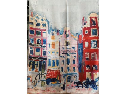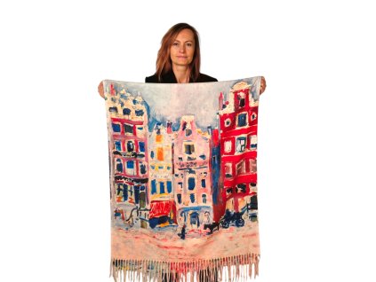 Oboustranná kašmírová šála s obrazem od Kees van Dongena - Amsterdamské domy. Z druhé strany je abstraktní obraz od neznámého autora s moderistickým motivem.