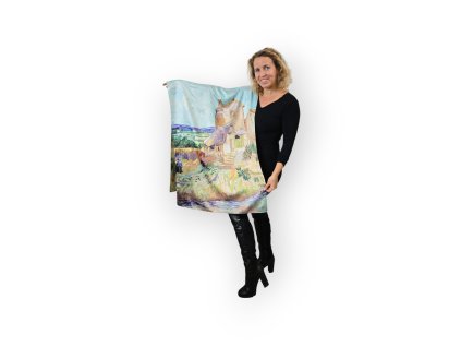 Oboustranná kašmírová šála s obrazem Mladé zahradnice od George Dunlopa Leslieho. Z druhé strany je obraz vesnice od Paula Cezana.
