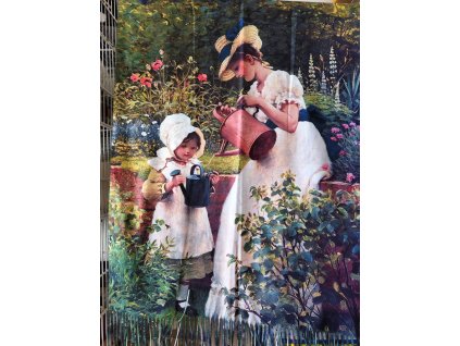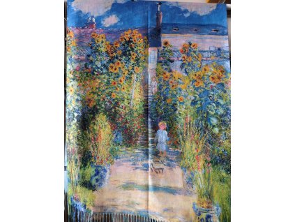Oboustranná kašmírová šála s obrazem Mladé zahradnice od George Dunlopa Leslieho. Z druhé strany je slavný obraz Procházka od Claude Moneta.