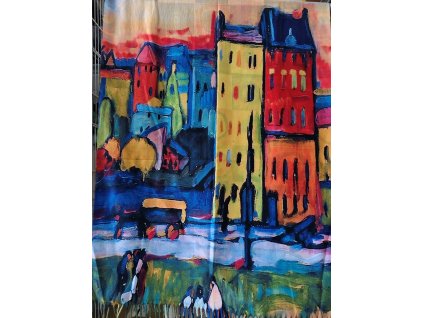 Oboustranná kašmírová šála s obrazem Mnichovských domů od Wasilly Kandinského. Z druhé strany je obraz od stejného autora Barevná studie čtverců.