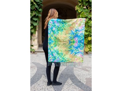 Oboustranná kašmírová šála s obrazem Claude Moneta - Zahrada ve Vetheuil. Z druhé strany šály je obraz nazvaný Sumertime od amerického impresionisty Fredericka Childe Hassama....