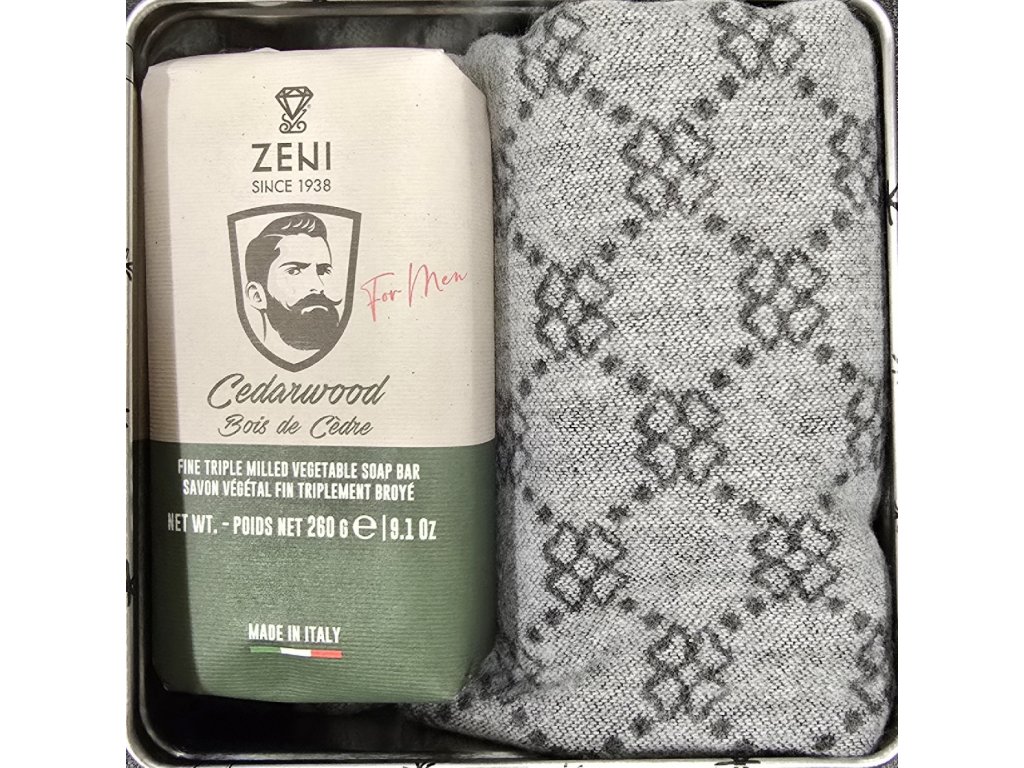 Dárková sada pro muže obsahující elegantní šálu a kvalitní italské mýdlo pro pány.
