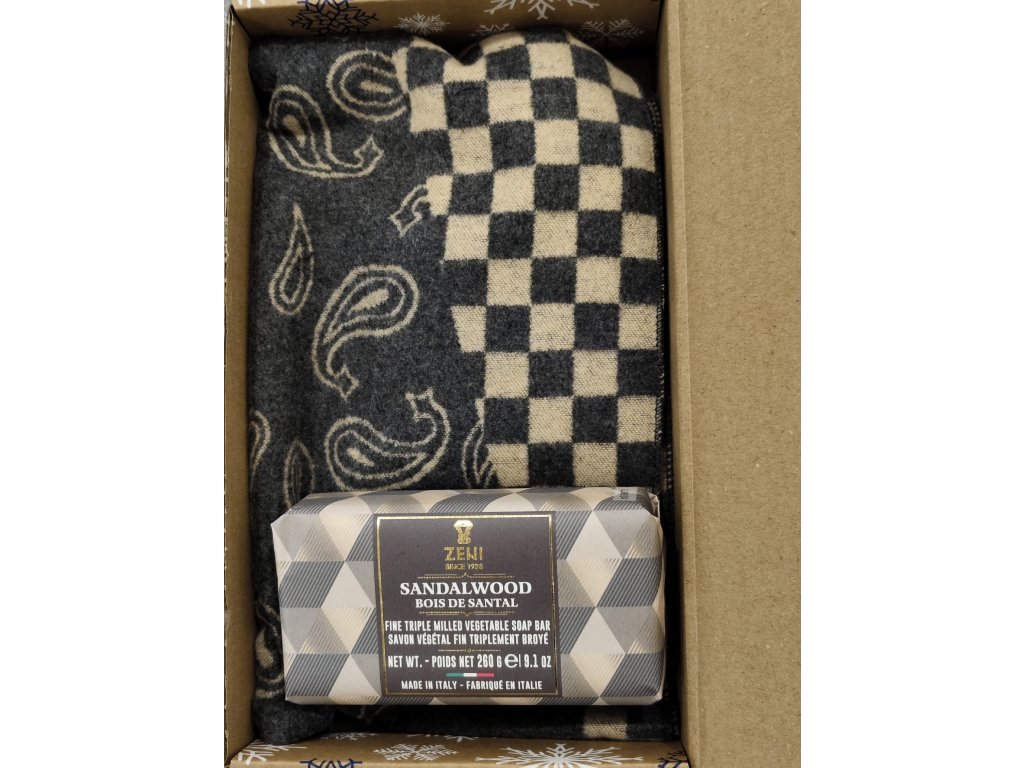Dárková sada pro muže obsahující elegantní šálu a kvalitní italské mýdlo pro pány.