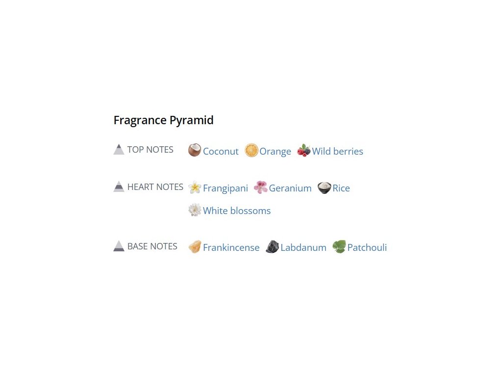 Skvěle ladí s růžovými tóny geránia a v této kompozici rozvíjejí nepopsatelně svěží zážitek, jenž okouzlí všechny vaše smysly. V úvodu vás přivítá zářivá vitalita květů frangipani, která se nenápadně proplétá s krémovou nótou tahitského kokosu.