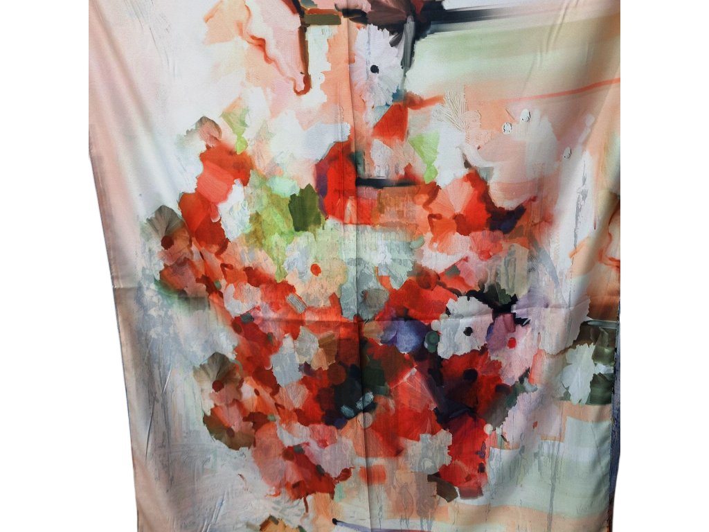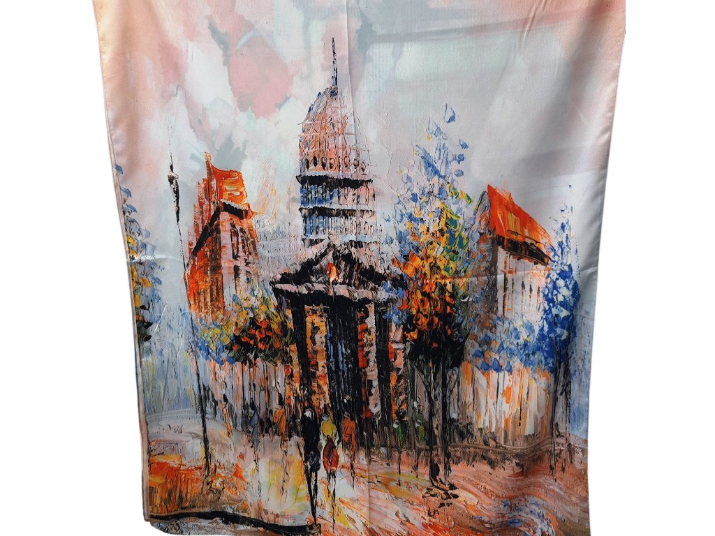 Oboustranná hedvábná šála s obrazem inspirovaným pařížskou baziliku Sacre Coeur, která se nachází na Montmartru. Z druhé strany je abstraktní obraz s motivem květů. Oba obrazy jsou od neznámých autorů.