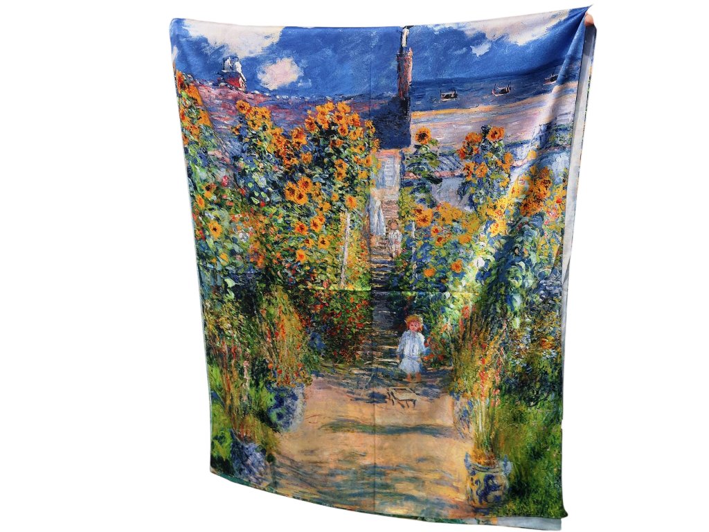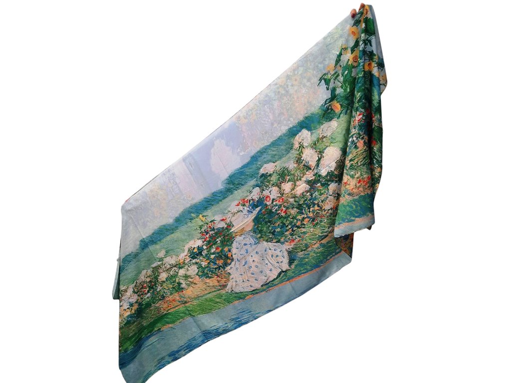 Oboustranný hedvábný šátek s obrazem od Claude Moneta - Zahrada ve Vetheuil. Z druhé strany šátku je obraz nazvaný Summertime od amerického impresionisty Fredericka Childe Hassama. Obě strany šátku k sobě jak barevně tak tématicky ladí.