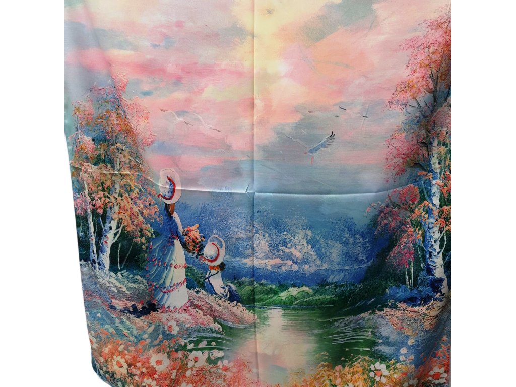 Oboustranná hedvábná šála s obrazem dívky u jezera na jedné straně a obrazem abstraktních květin na druhé straně.