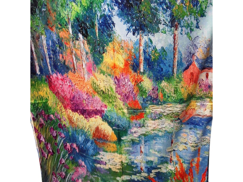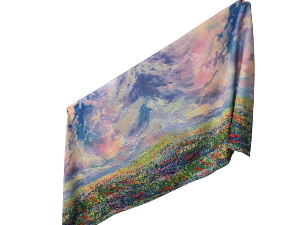 Oboustranná hedvábná šála s obrazem domu u jezera na jedné straně a obrazem pole květin pod oblačnou oblohou na druhé straně.