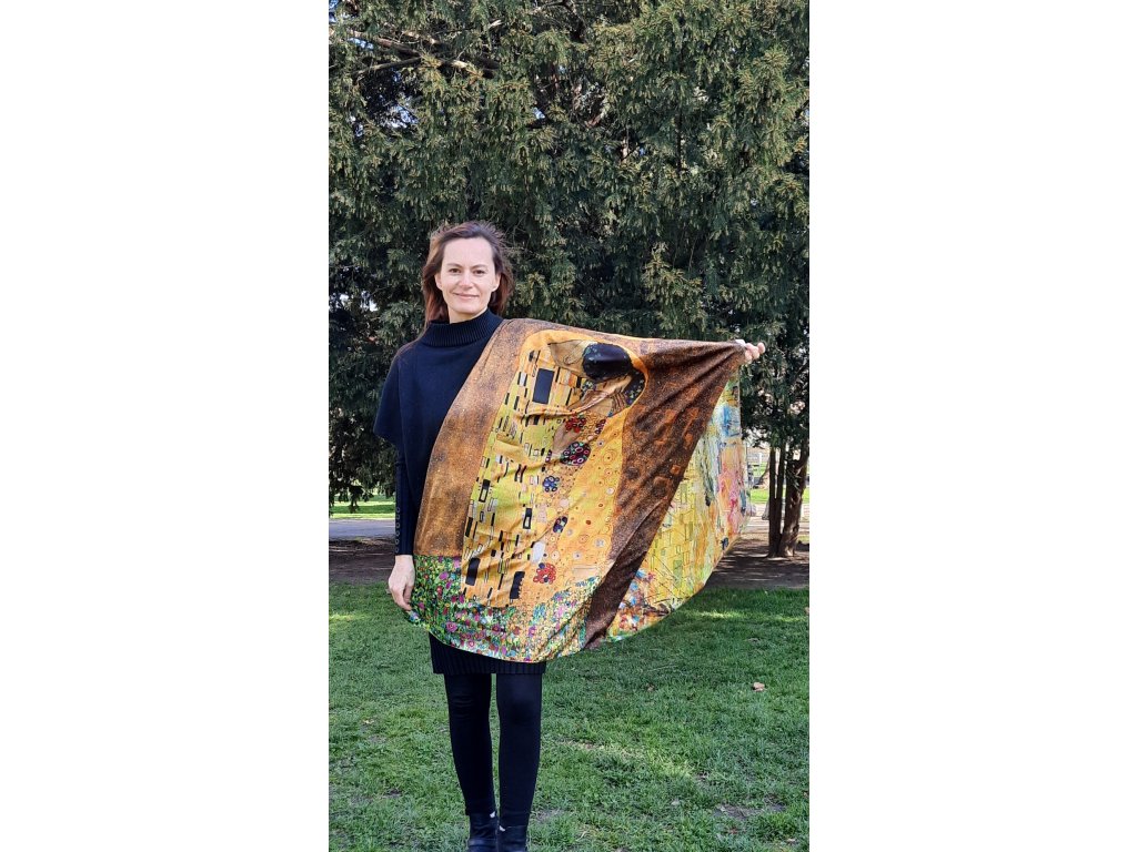 Oboustranná hedvábná šála s obrazy od Gustava Klimta - Polibek a z druhé strany šály je obraz Adele.