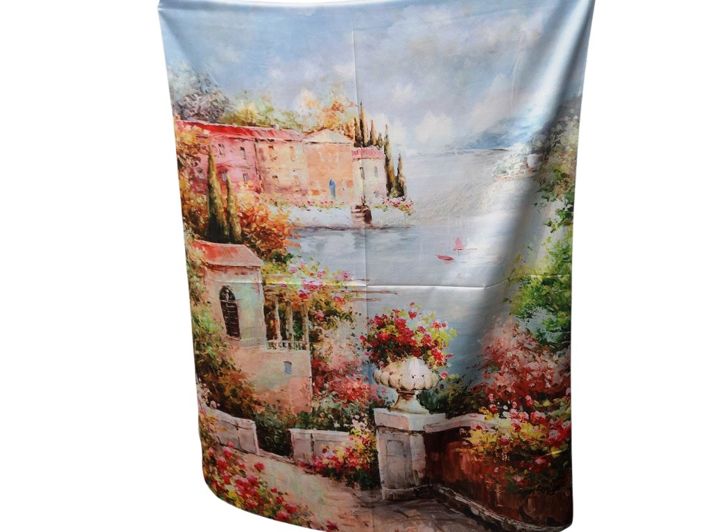 Oboustranná hedvábná šála s obrazem zachycujícím pohled z terasy venkovské vily, pravděpodobně v Itálii. Z druhé strany je obraz s domky u jezera. Oba obrazy jsou od neznámých autorů.