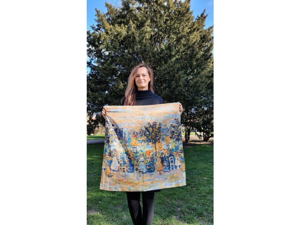 Oboustranný hedvábný šátek s obrazem od Gustava Klimta - Strom života. Z druhé strany šátku je obraz od Maurice Prendergasta - V lucemburských zahradách. Obě strany šátku k sobě výtečně barevně ladí.
