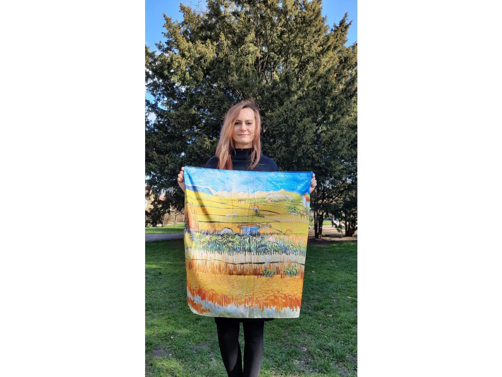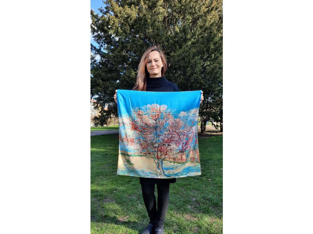 Oboustranný hedvábný šátek s obrazem Růžové broskvoně od Vincenta van Gogha. Z druhé strany šátku je obraz Pohled na rovinu v Crau u Arles od stejného autora.