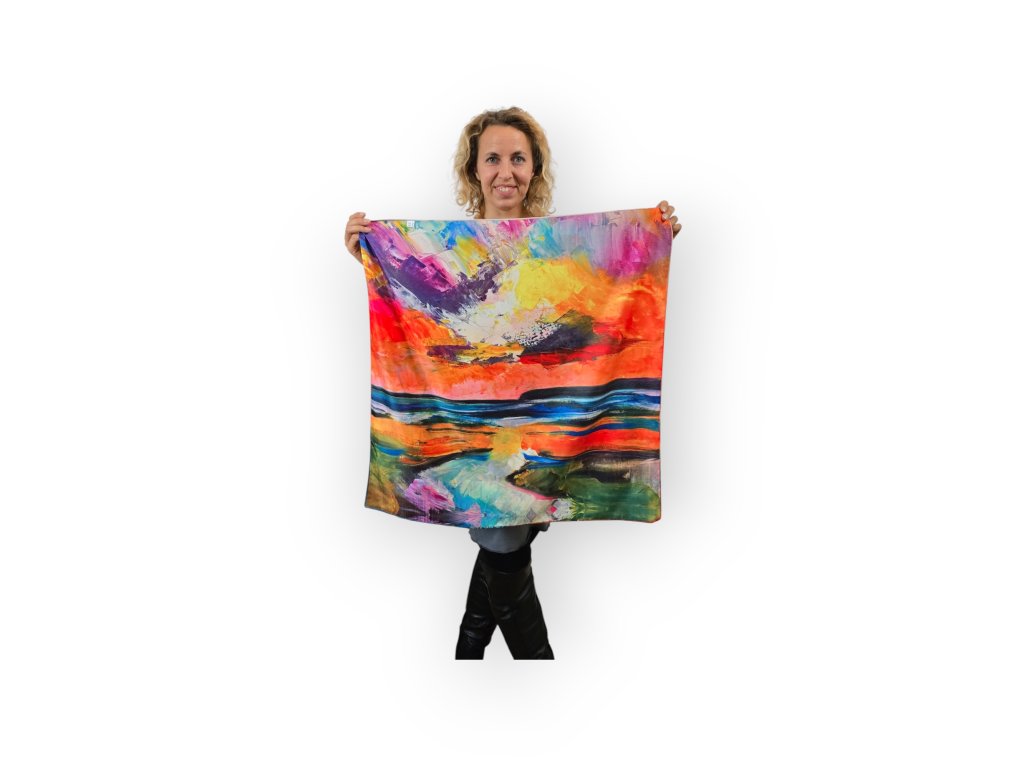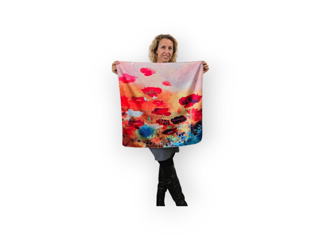 Oboustranný hedvábný šátek s obrazy Vlčích máků na jedná straně a abstrakce západu Slunce na druhé straně.