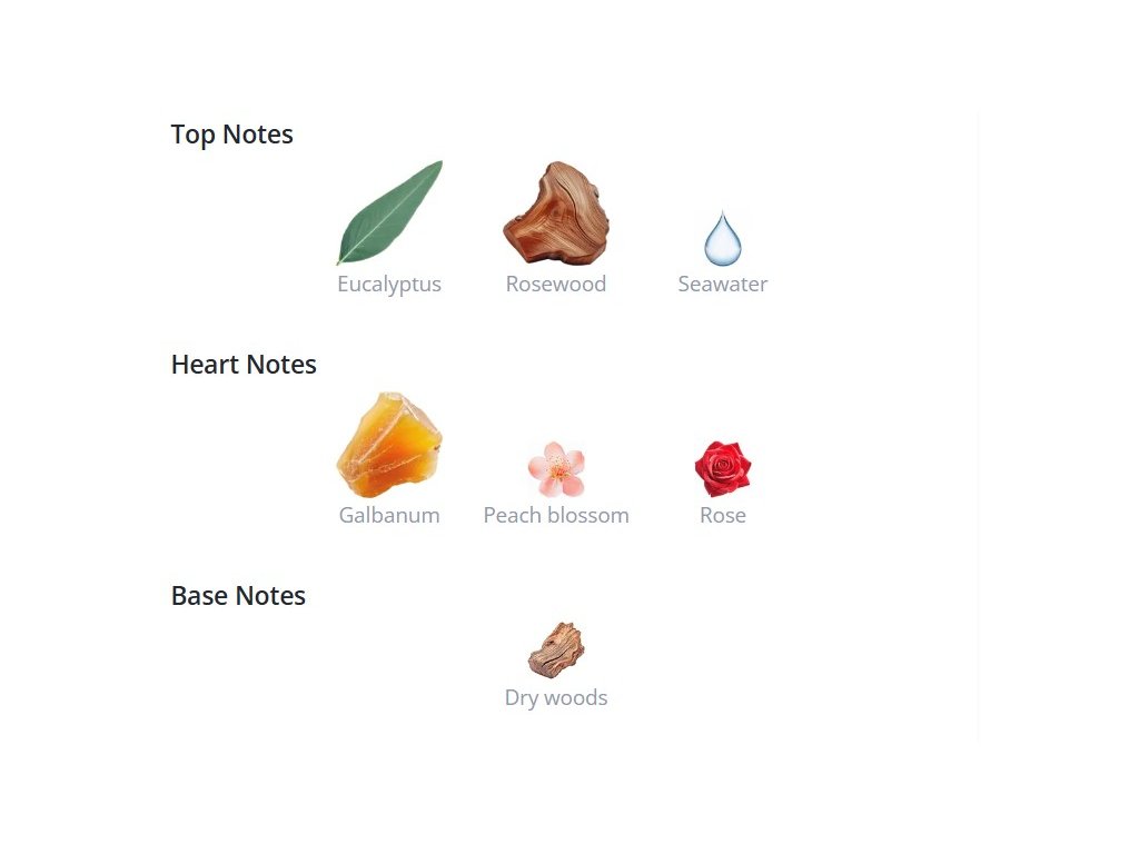 Slaná voda, eukalyptus, palisandr, galbanum, květ broskvoně, růže, sušené dřevo.