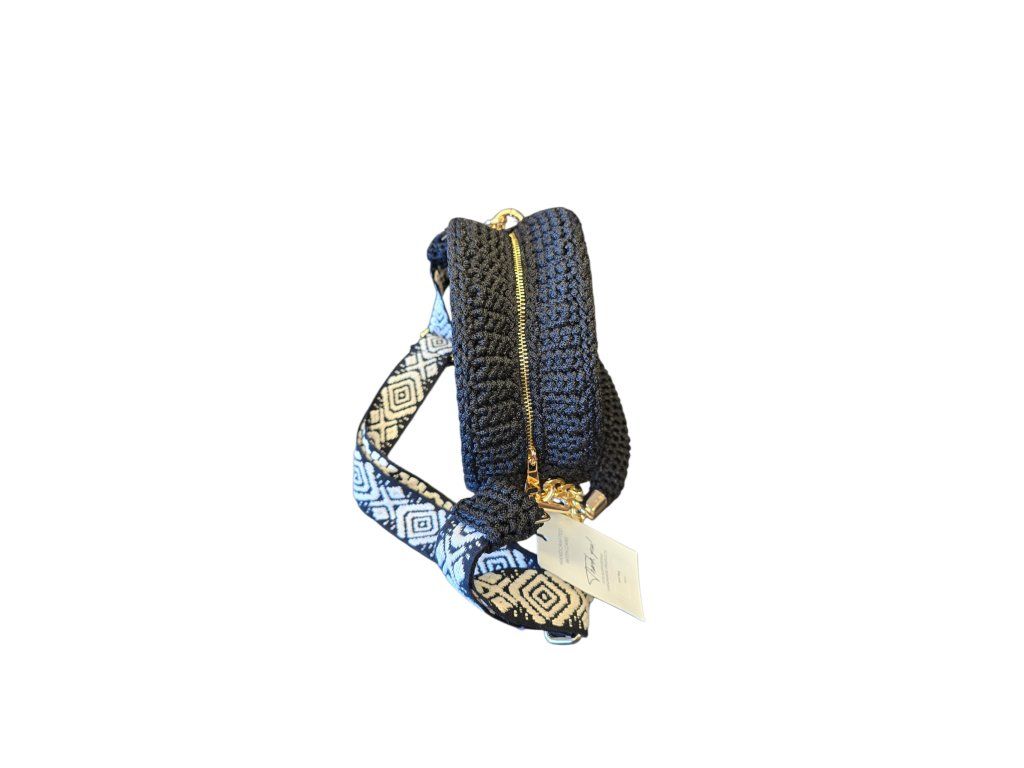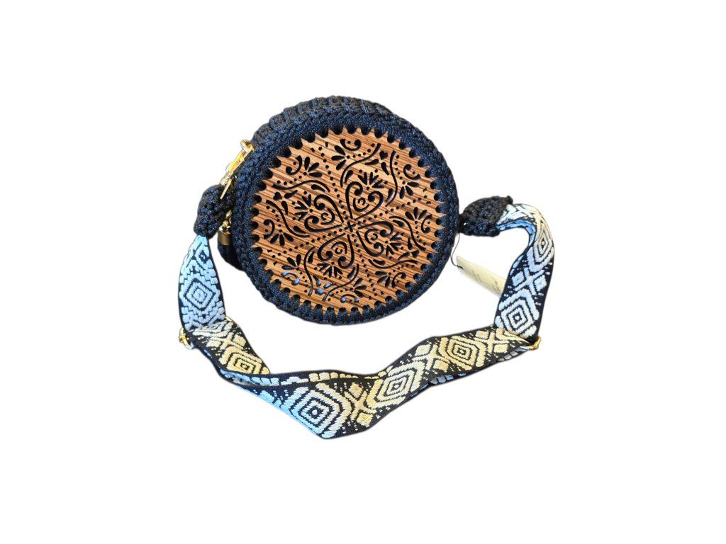 Ručně vyrobená háčkovaná kabelka z dílny Iliase Vardavakise s dřevěnými prvky v klasické černé barvě. Ideální na letní procházky městem, večery s nádechem designu. Kabelka s unikátním kulatém designu s hedvábným popruhem přes rameno.
