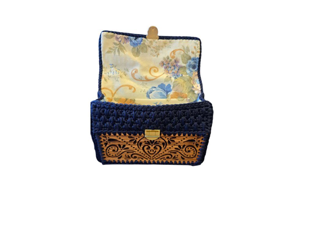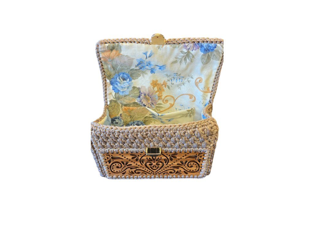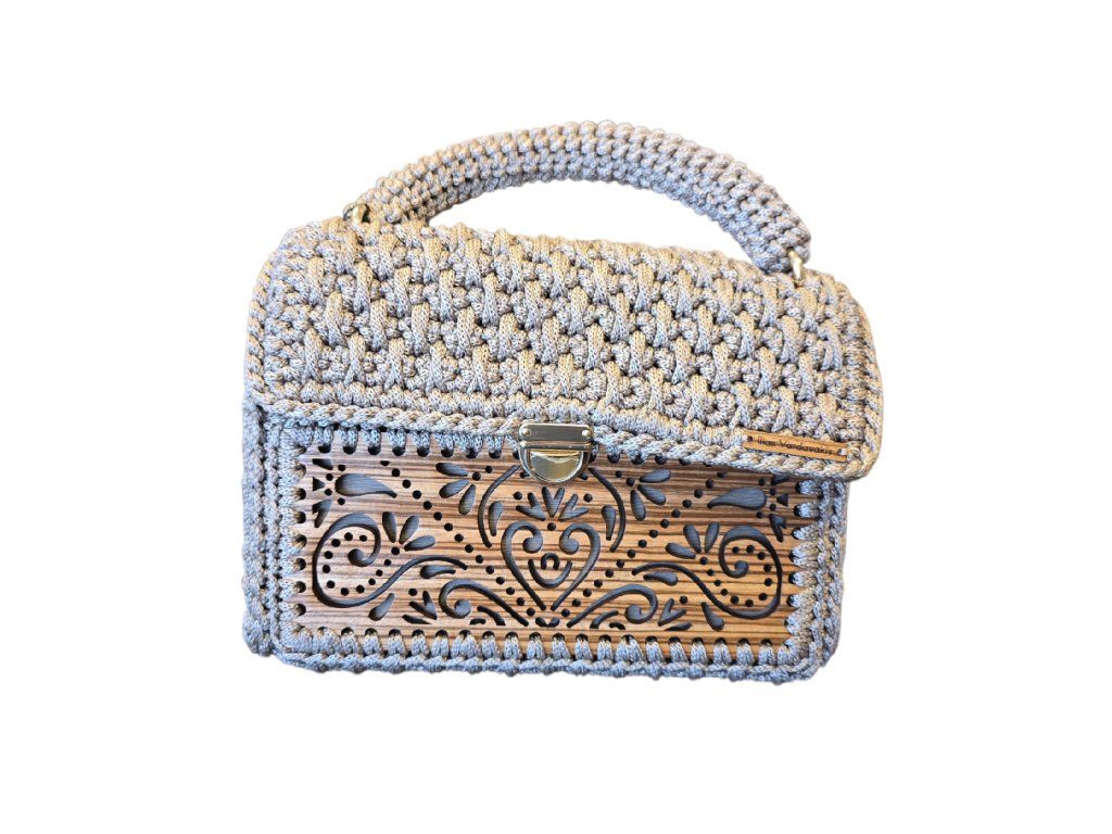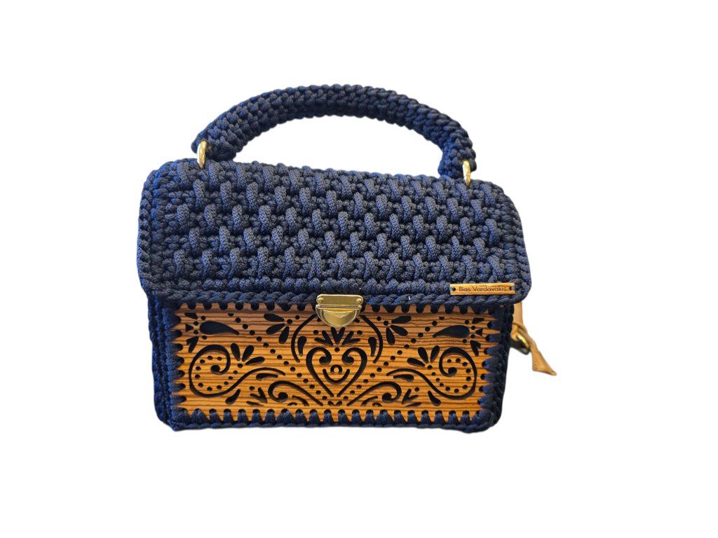 Ručně vyrobená háčkovaná kabelka z dílny Iliase Vardavakise s dřevěnými prvky. Ideální na letní procházky městem, večery s nádechem designu. Tato kabelka, vyrobená ze zebranového dřeva a vysoce kvalitní příze, kombinuje funkčnost s úžasnou estetikou.