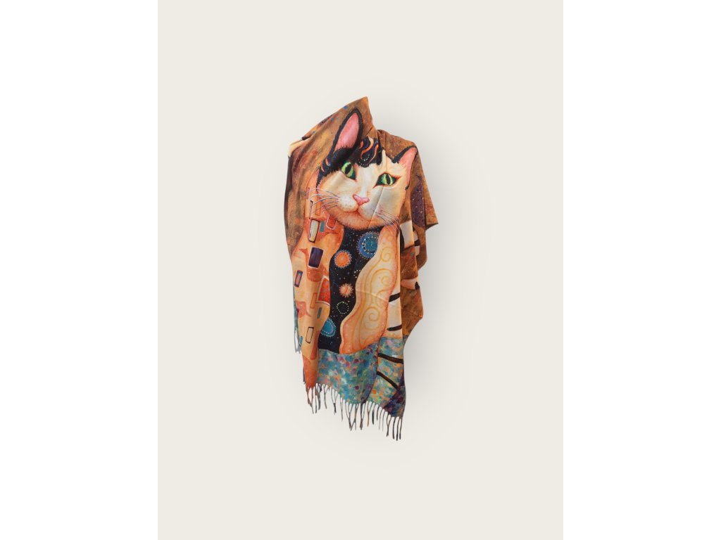 Oboustranná kašmírová šála s obrazem kočky napodobující stylem obrazy od Gustava Klimta.