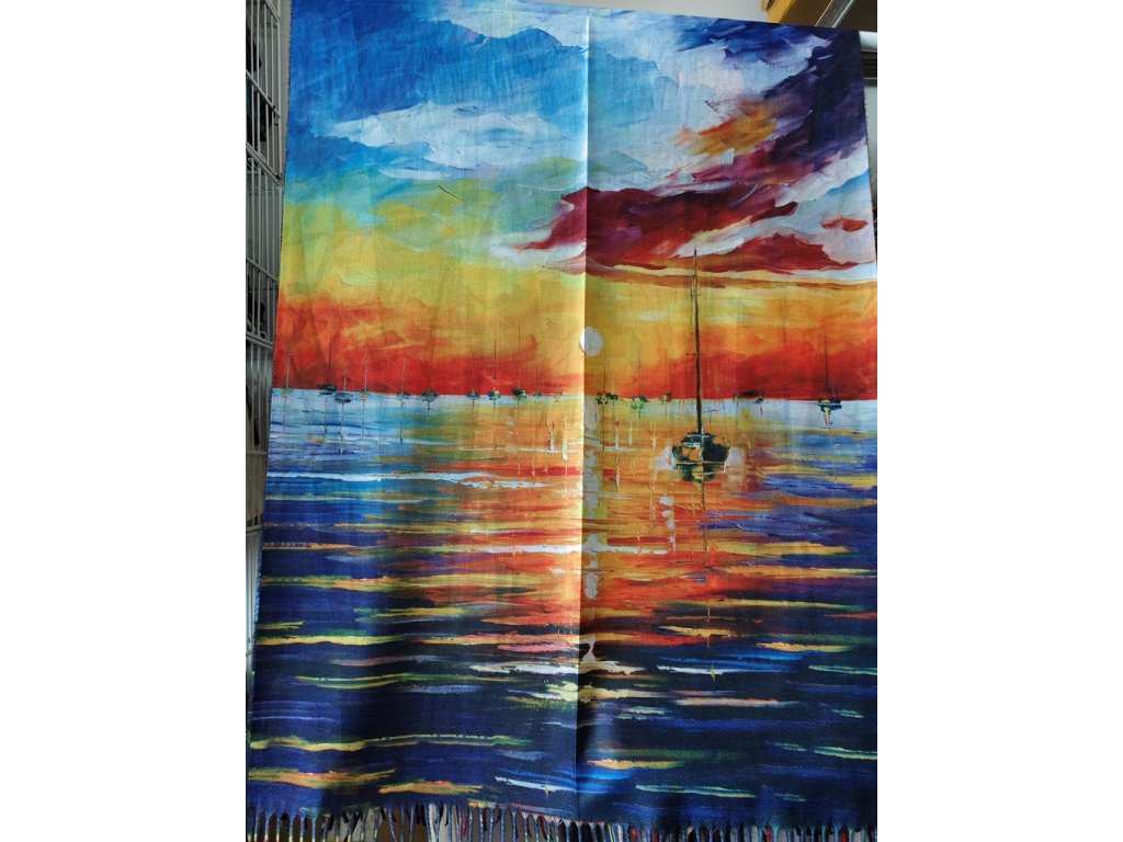Oboustranná kašmírová šála s obrazem Leonida Afremova - Cesta parkem. Z druhé strany šály je obraz zapadajícího slunce. Oba obrazy jsou od stejného autora.