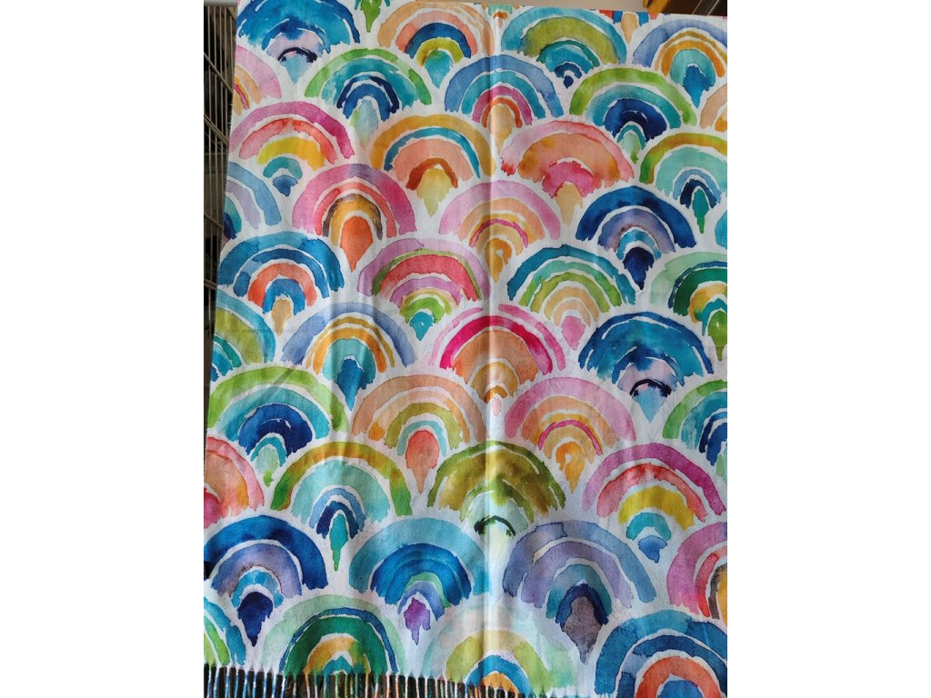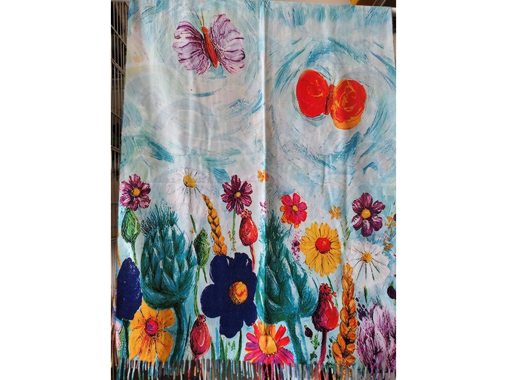 Oboustranná kašmírová šála s obrazem motýlů nad květinovým polem. Z druhé strany je obraz duhy. Oba obrazy jsou od neznámých autorů.