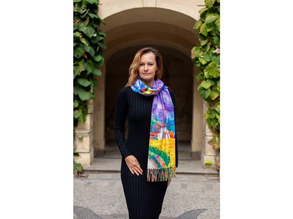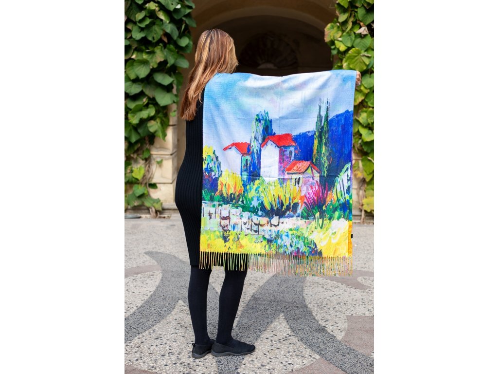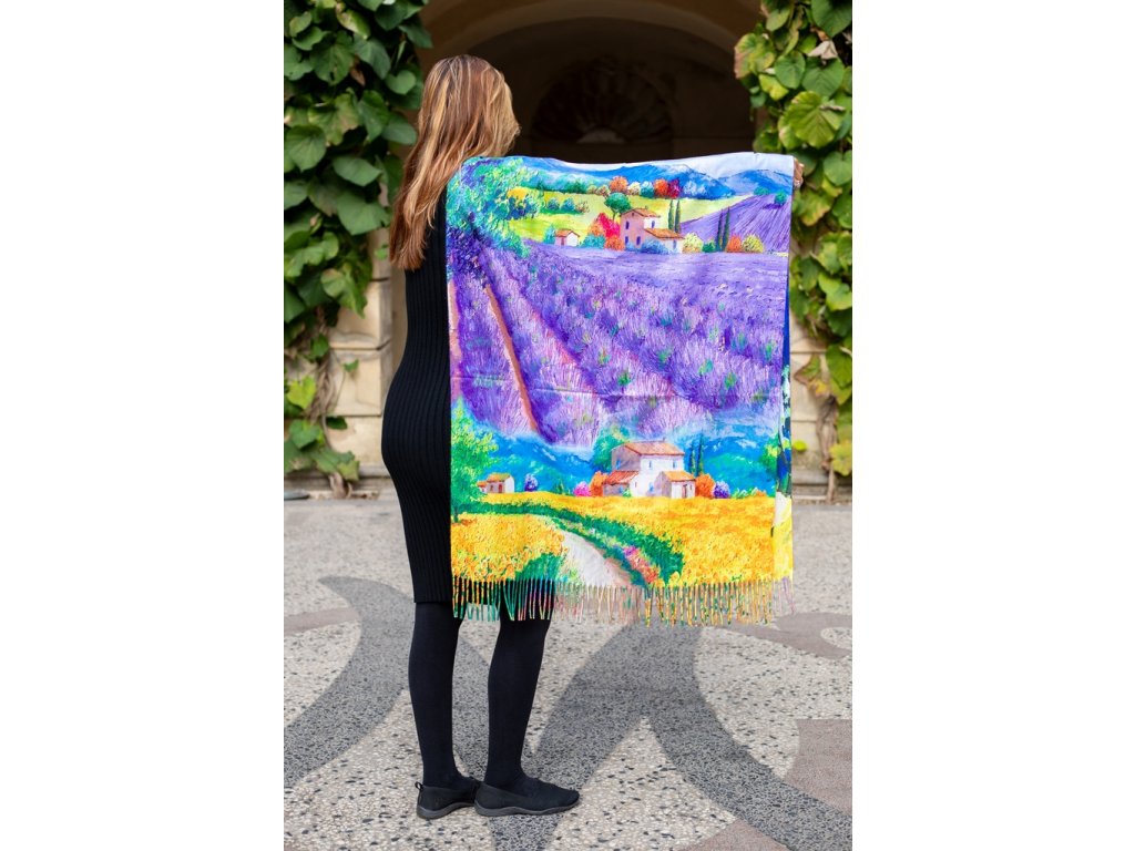 Oboustranná kašmírová šála s obrazem Slunečnice a levandulová pole. Z druhé strany šály je Kostel od neznámého autora. Šála je hřejivá nejen materiálem, ale i letním motivem, který Vaše myšlenky přenese do vyhřáté Francie na konci horkého srpnového dne.