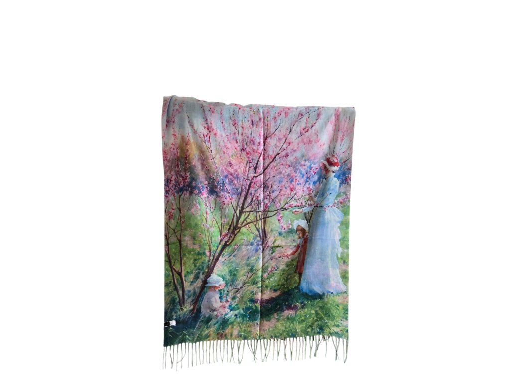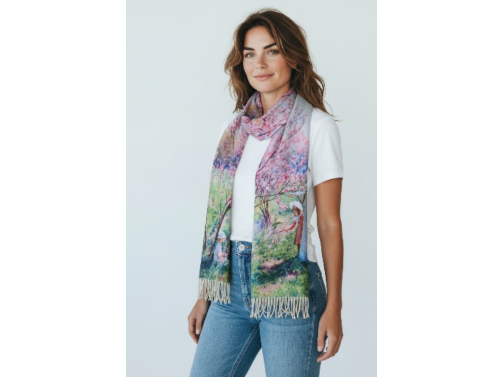 Oboustranná kašmírová šála s obrazem Růžových květů. Z druhé strany Západ Slunce.