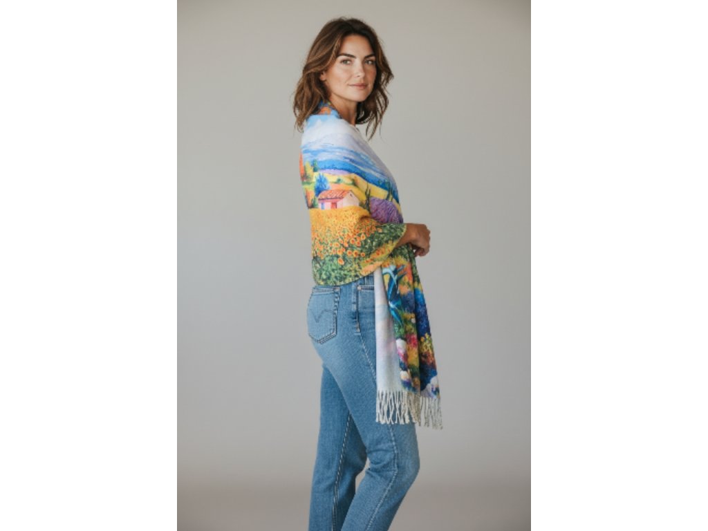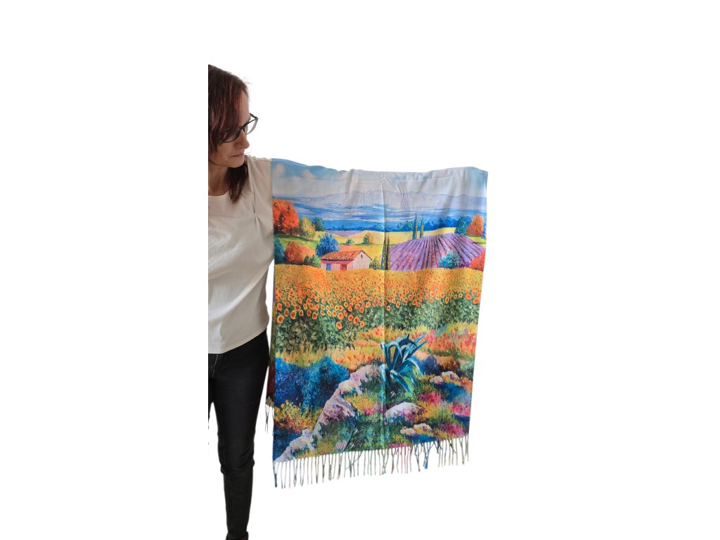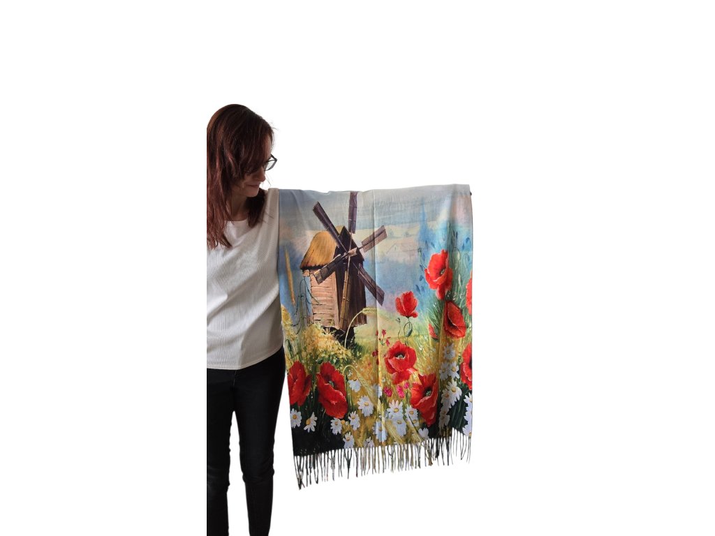 Oboustranná kašmírová šála s motivem větrného mlýnu a velkých vlčích máků. Z druhé strany je obraz levandulových polí.