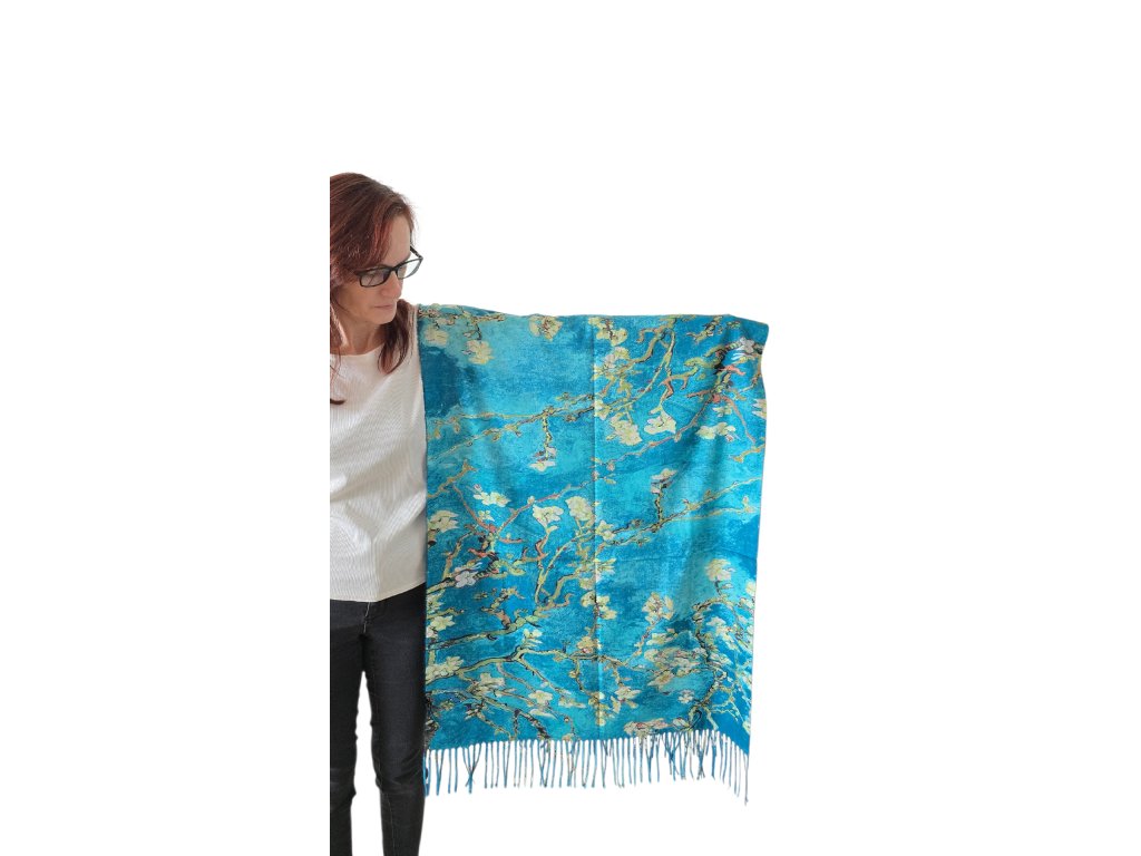 Oboustranná kašmírová šála s motivem Mandlových květů od Vincenta van Gogha. Z obou stran šály je stejný motiv, jen v jiném barevném provedení.