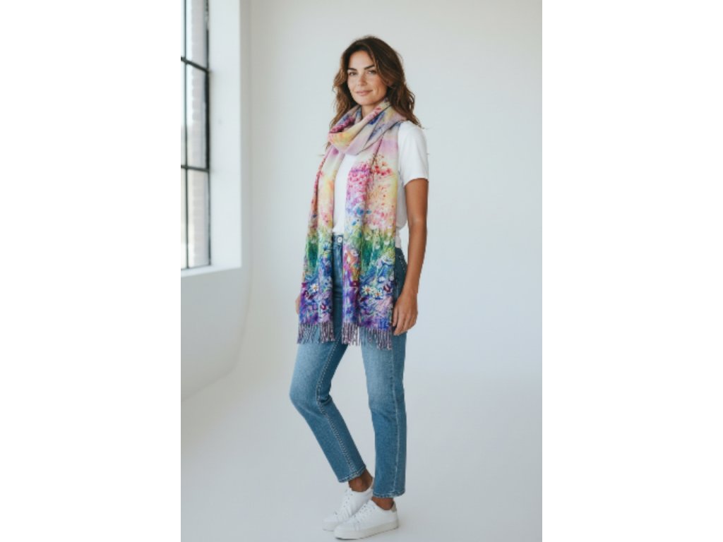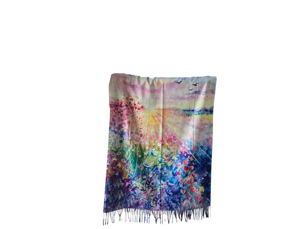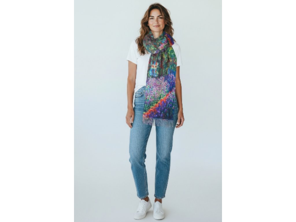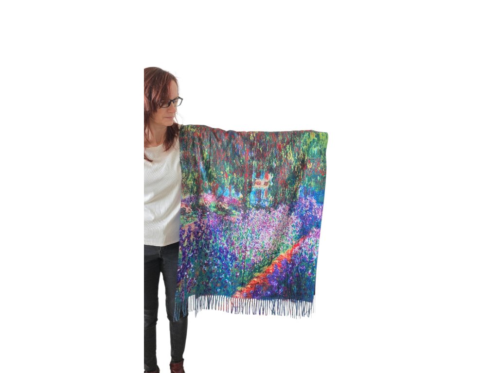 Oboustranná kašmírová šála s obrazem od Clauda Moneta - Zahrada v Giverny. Z druhé strany je abstrakce západu slunce od neznámého autora.