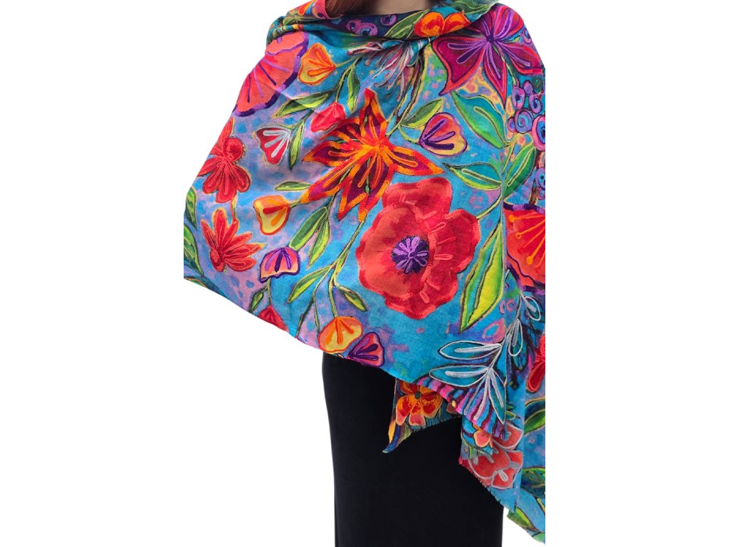 Výrazné barevné kombinace a květinové vzory dodávají šále jedinečný charakter a šmrnc, takže se stává nepřehlédnutelným doplňkem pro každou příležitost.