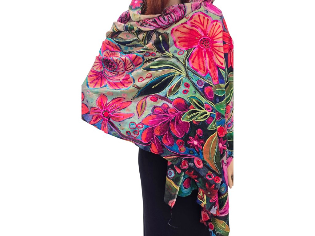 Výrazné barevné kombinace a květinové vzory dodávají šále jedinečný charakter a šmrnc, takže se stává nepřehlédnutelným doplňkem pro každou příležitost.