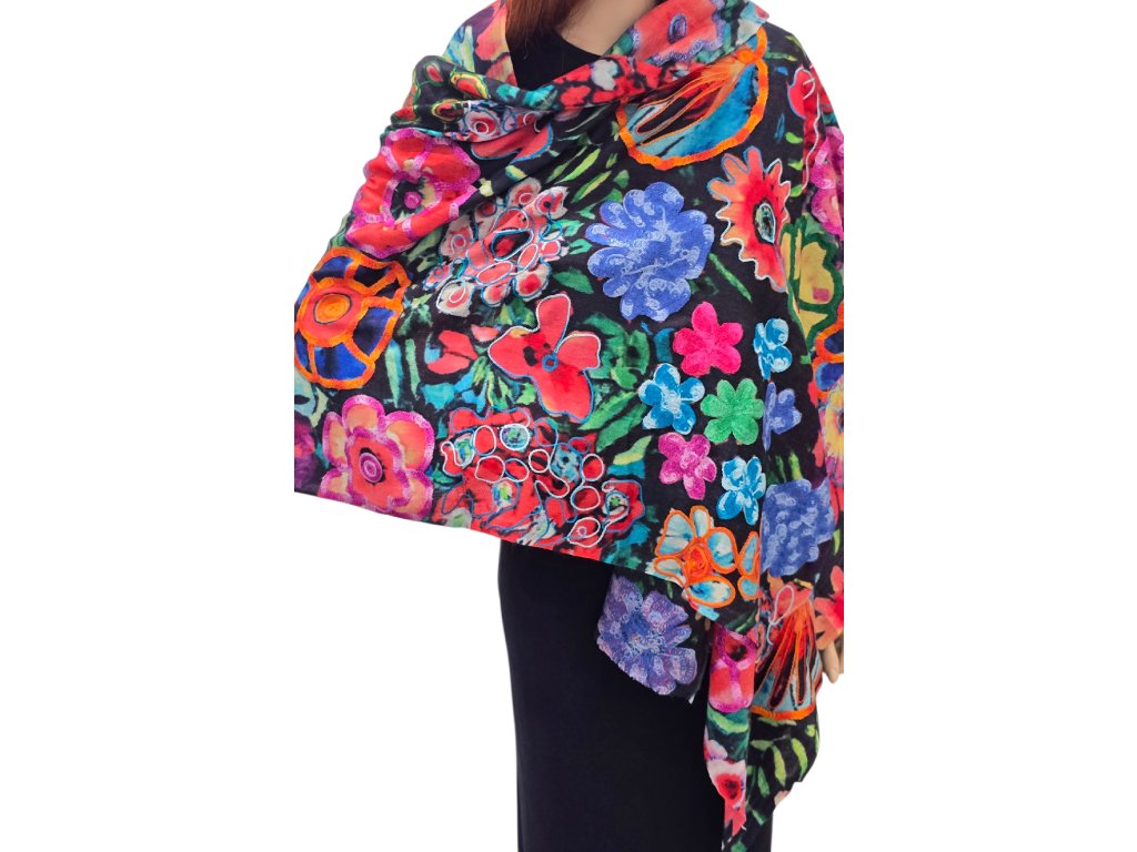 Výrazné barevné kombinace a květinové vzory dodávají šále jedinečný charakter a šmrnc, takže se stává nepřehlédnutelným doplňkem pro každou příležitost.