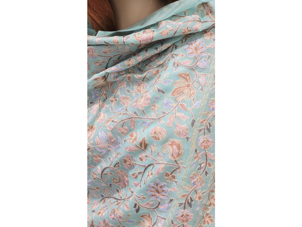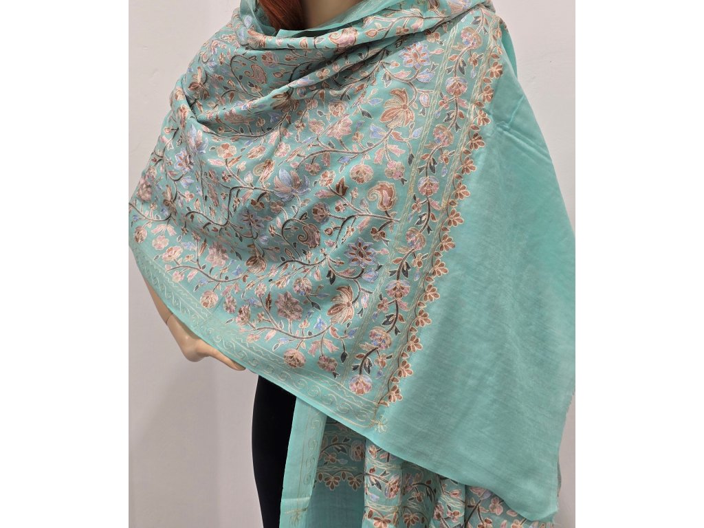 Lehká kašmírová šála s vyšívanými vzory - tyrkysová