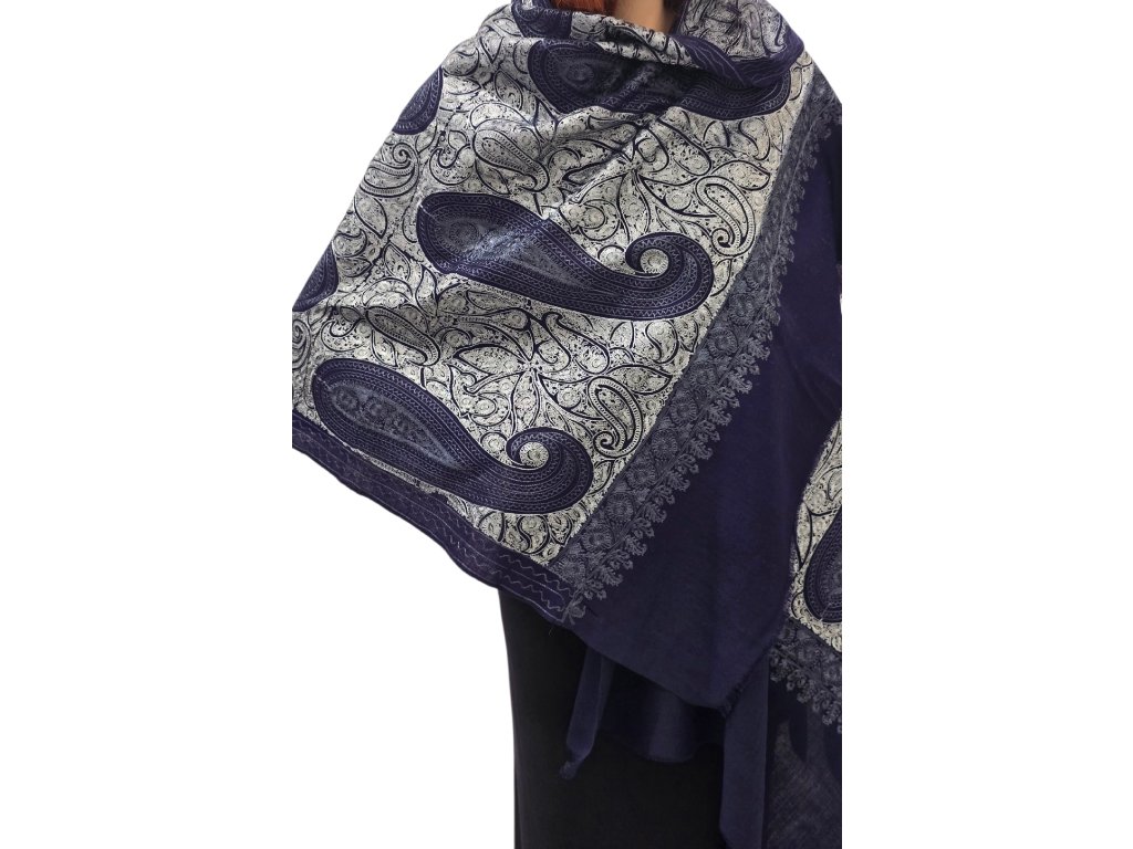 Lehká vlněná šála s vyšívanými vzory - tmavě modrá