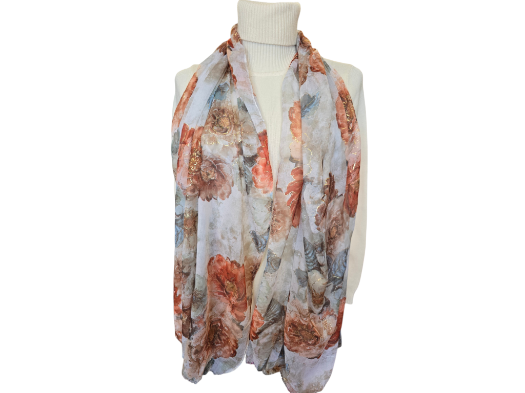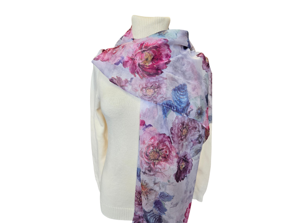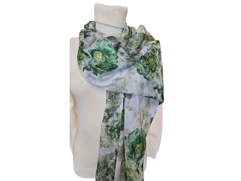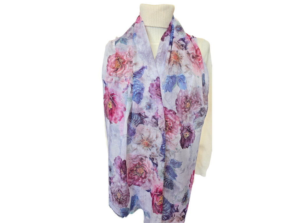 Jednostranná lehká šála s motivem letních květů v několika barevných variantách. Vdechněte svému letnímu šatníku svěžest a rozmanitost s naší lehkou šálou s květinovým motivem.