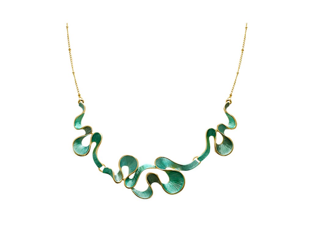 Tento elegantní náhrdelník je vyrobený ze zinkových slitin a zdobený unikátním šperkařským smaltem. Řetízek je pokovený do barvy žlutého zlata.