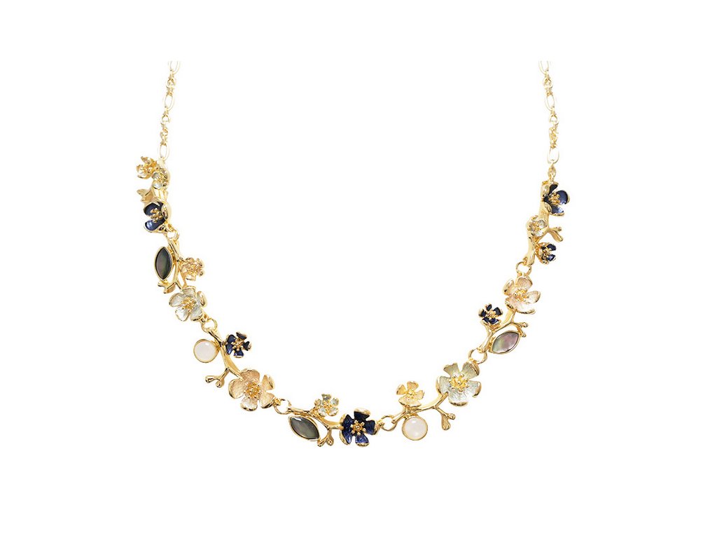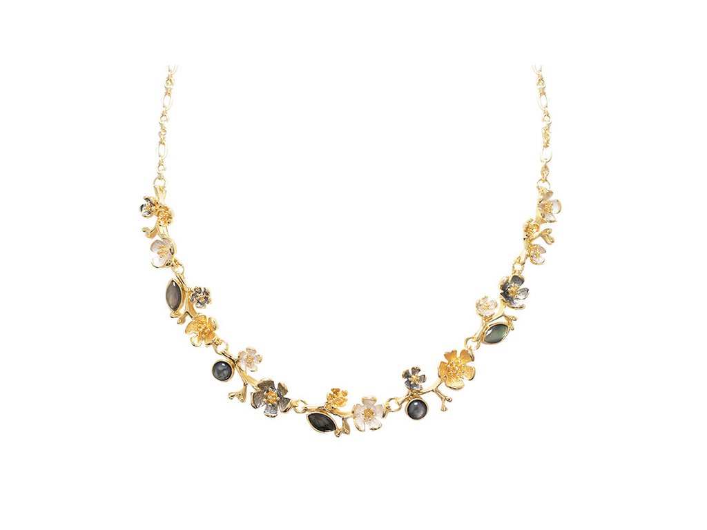 Tento jemný a elegantní náhrdelník je vyrobený ze zinkových slitin a zdobený unikátním šperkařským smaltem. Řetízek je pokovený do barvy žlutého zlata.