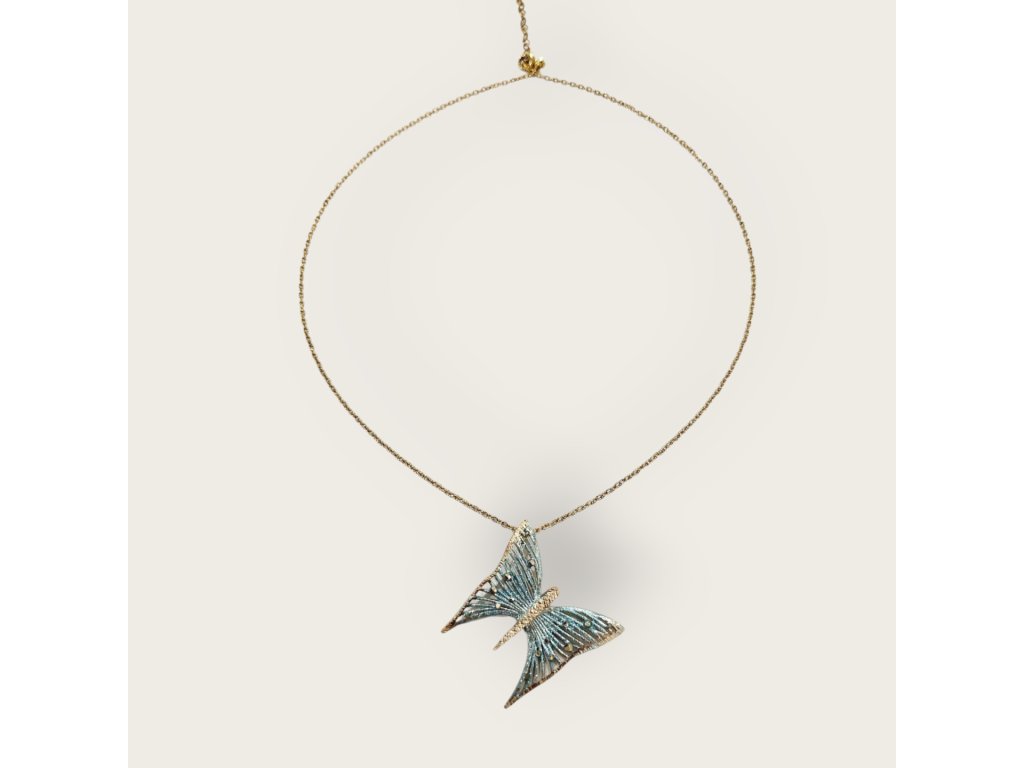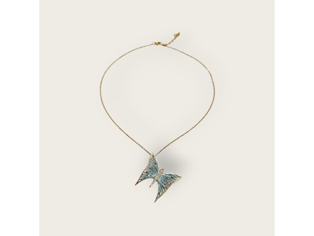 Motýlí motiv je pečlivě zpracován z mosazi, což šperku dodává odolnost a jedinečný charakter. Povrch náhrdelníku je zdoben patinou, která jemně podtrhuje jeho strukturu a vytváří kouzelný umělecký vzhled. Barvy patiny a její jemné odstíny působí jako připomínka přírodních krás řeckého ostrova Aegina, kde se tento náhrdelník zrodil.