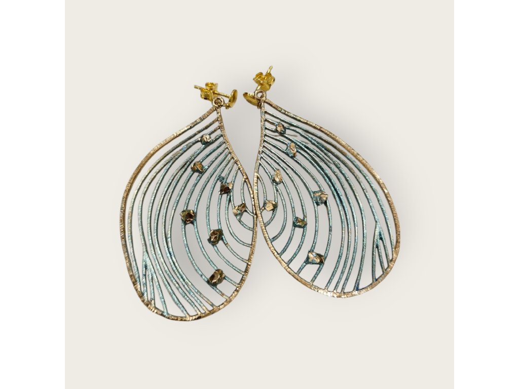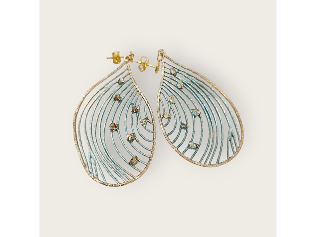 Náušnice inspirované listy přírody, ve tvaru kapky s reliéfními křivkami zachycují pohyb a přirozený tok listů ve větru. Patina zdůrazňuje organické linie designu a vytváří jedinečný a elegantní efekt. Jemné krystalky zasazené do povrchu náušnic jim dodávají jiskru, připomínající svěží kapky rosy na ranních lístcích. Náušnice jsou oslavou přírodních krás a propojení elegance s jednoduchostí. Představují harmonii mezi uměním a přírodou, přinášejíc do každodenního života kouzlo přirozeného světa.