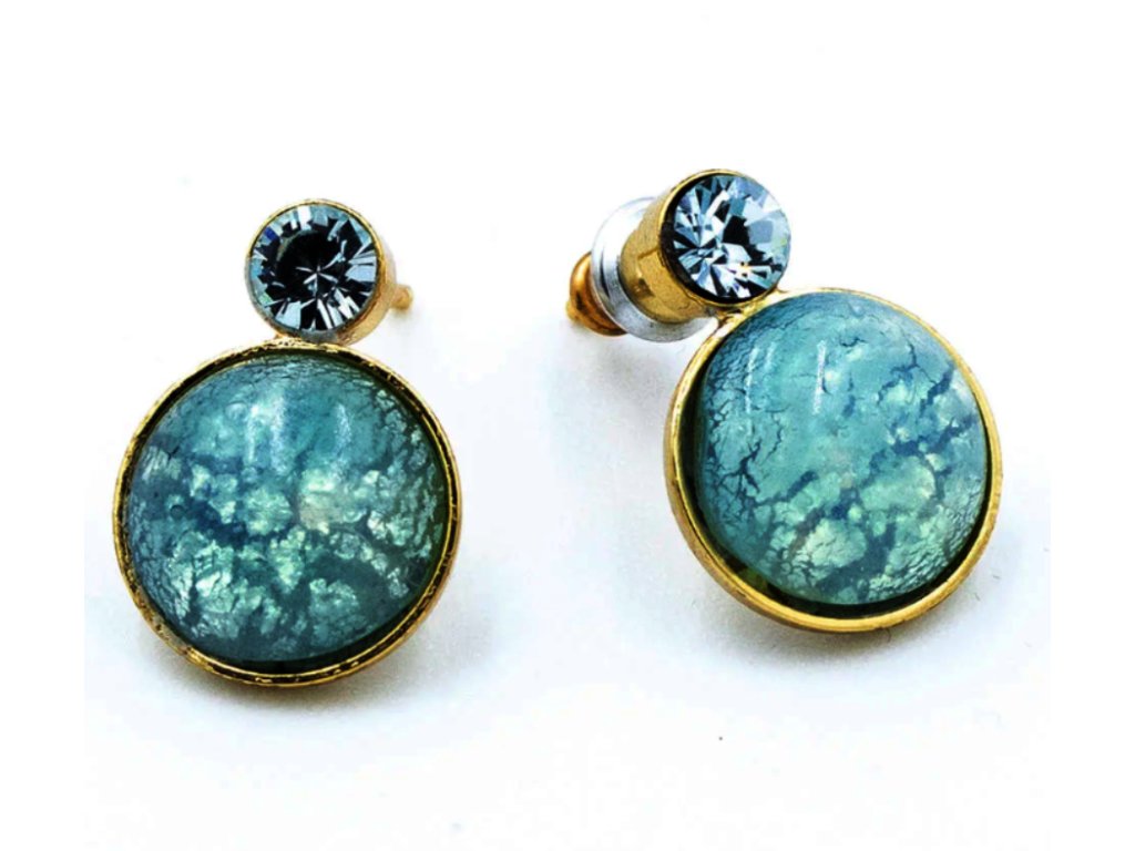 Tyto elegantní náušnice z nerezové oceli jsou zdobeny malým křišťálem a ručně vyráběným českým skleněným kabošonem (průměr cca 10 mm).