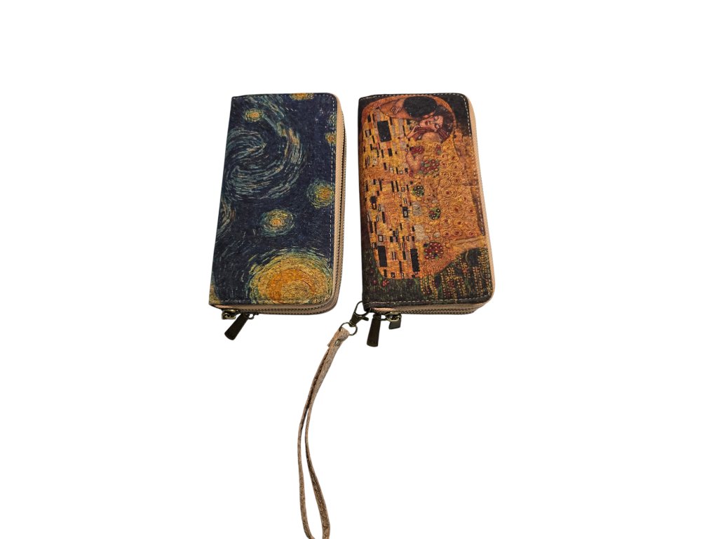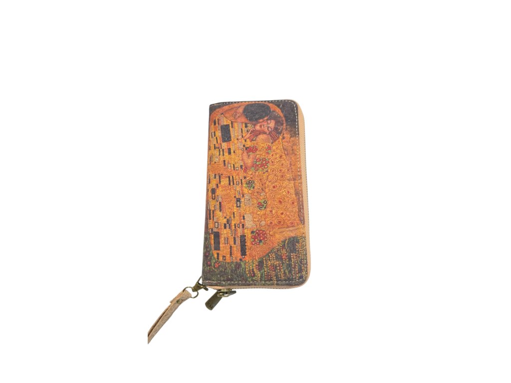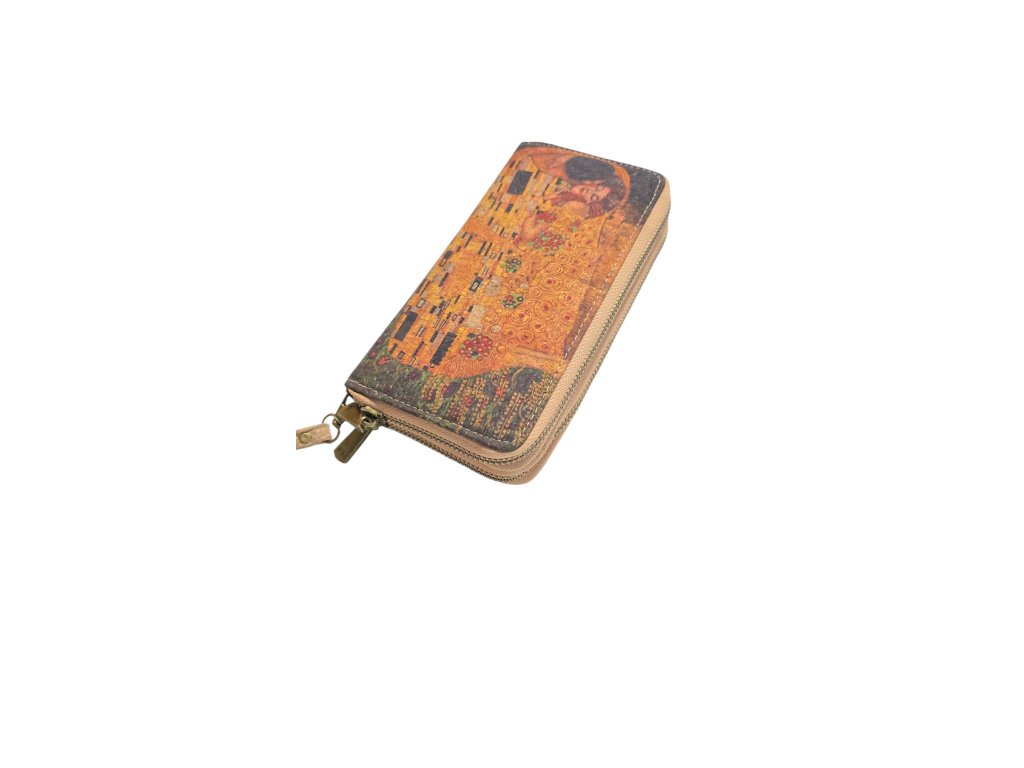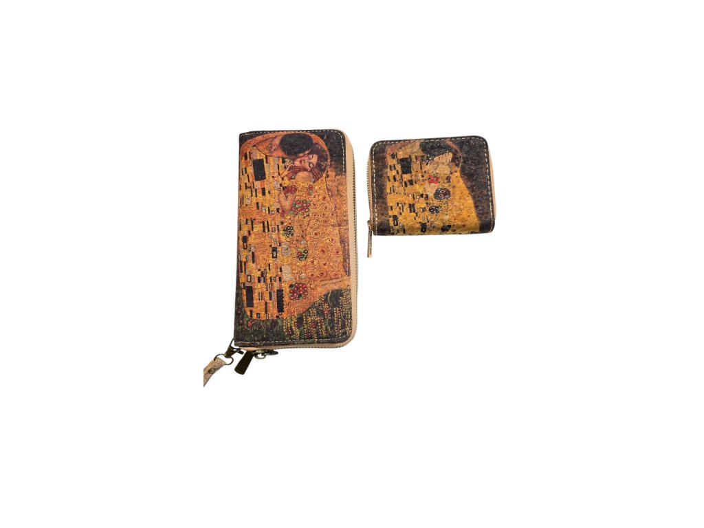 Velká dvojitá korková peněženka s motivem Polibku. Peněženka má dva zipy, mnoho přihrádek na peníze, karty i mince. K peněžence je poutko na zápěstí s karabinkou.