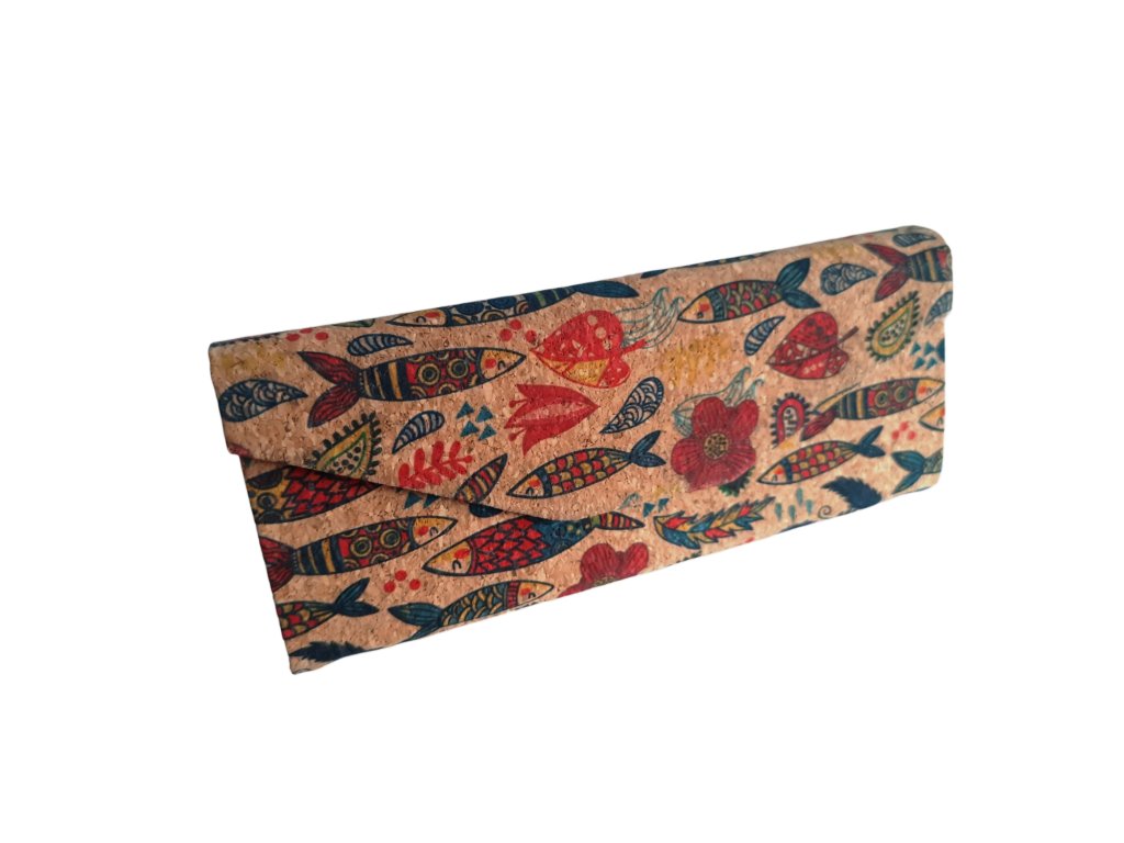 Skládací pouzdro na brýle z korkového materiálu, do kterého se vejdou i středně velké sluneční brýle. Pouzdro má veselý design rybiček.