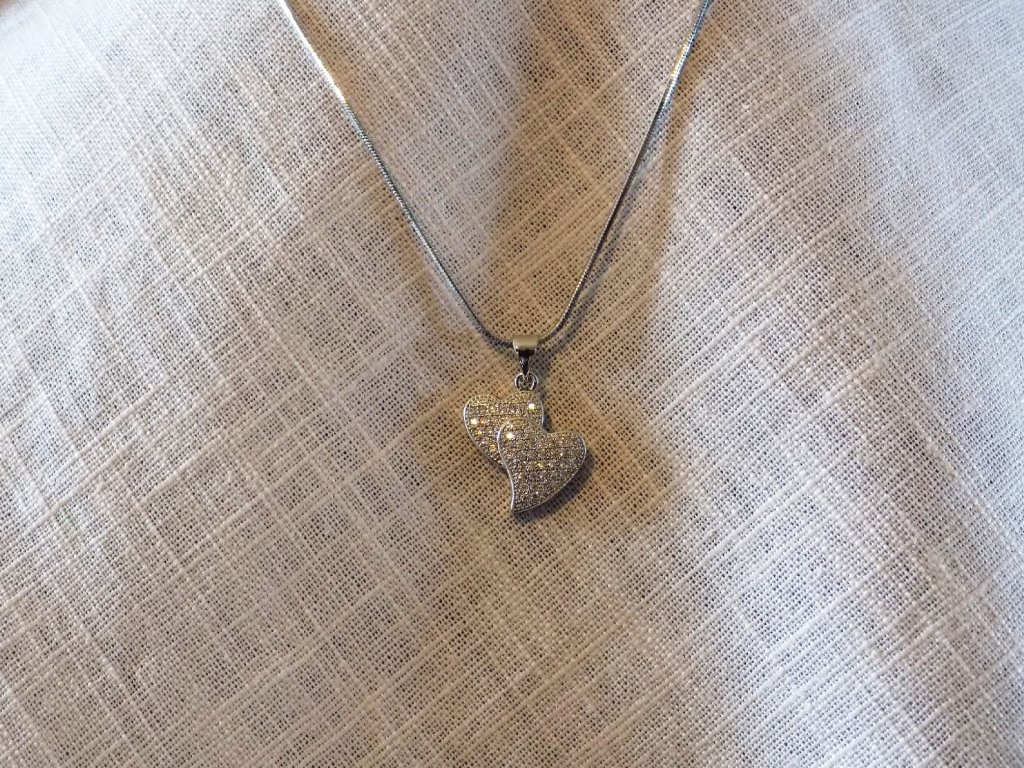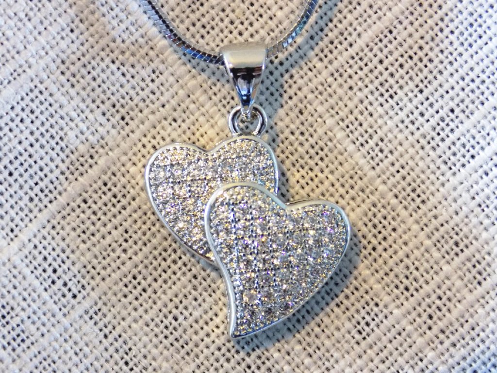 Ocelový řetízek s přívěskem v podobě dvou prolínajících se srdcí vykládaných zirkony.