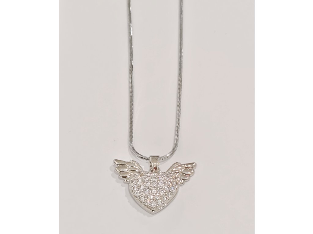 Ocelový řetízek s přívěskem v podobě okřídleného srdce vykládaného kamínky.