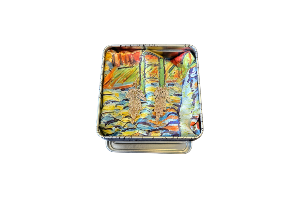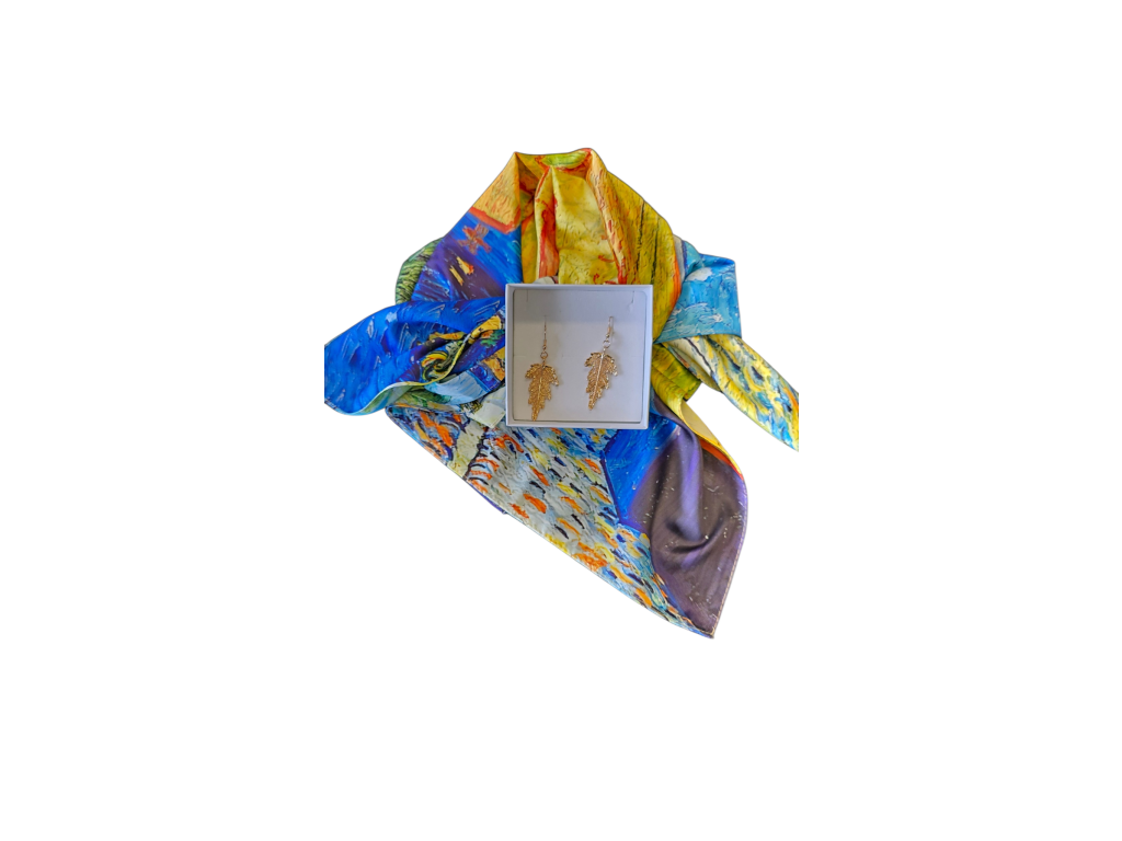 Elegantní šátek s obrazy od Vincenta van Gogha a unikátním šperkem z pravého listu v dárkové krabičce.