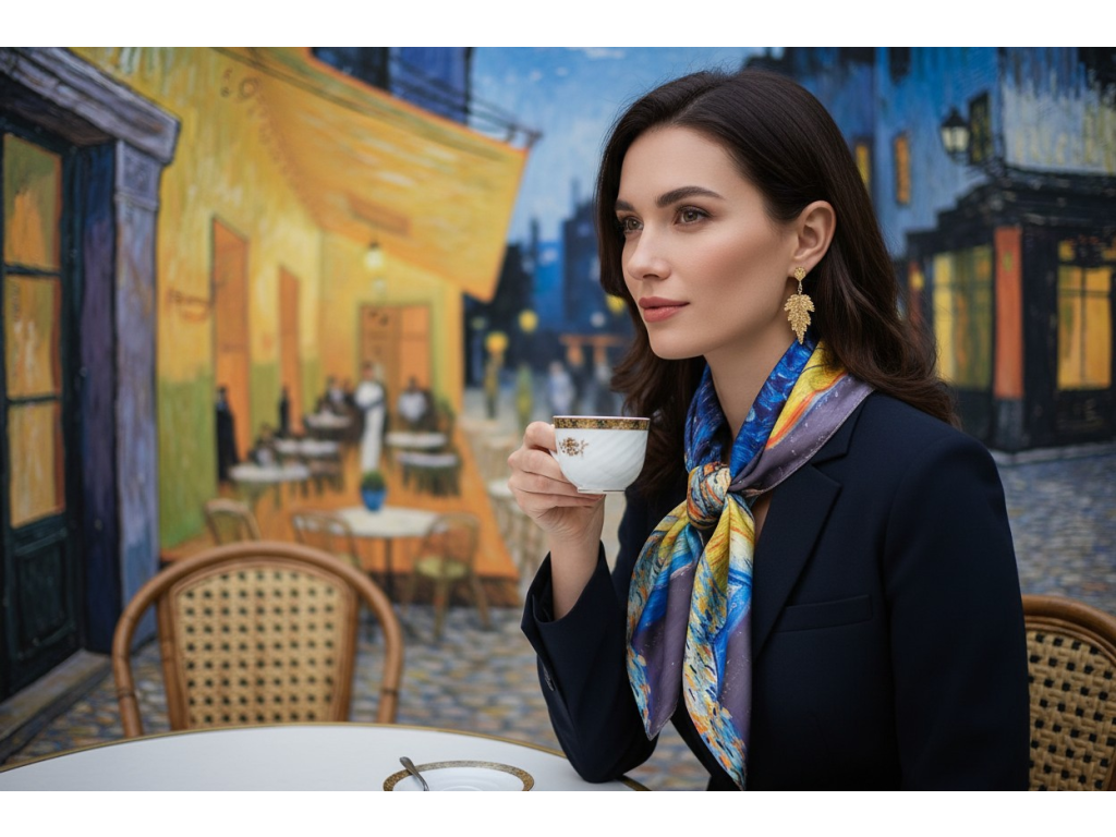 Oboustranný obrazový šátek - Terasa kavárny v noci / Morušovník