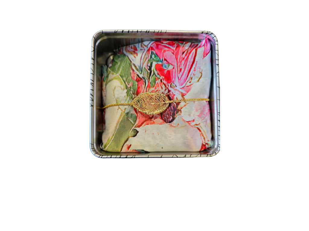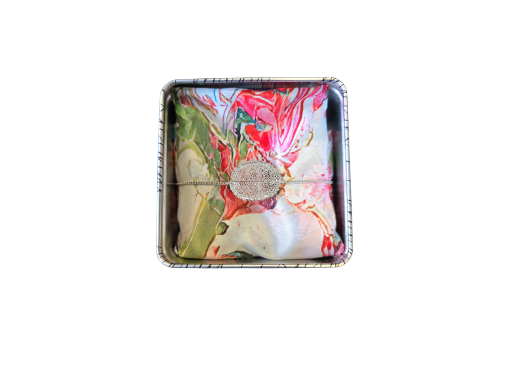 Elegantní šátek s obrazy Růží a unikátním šperkem z pravého listu v dárkové krabičce.