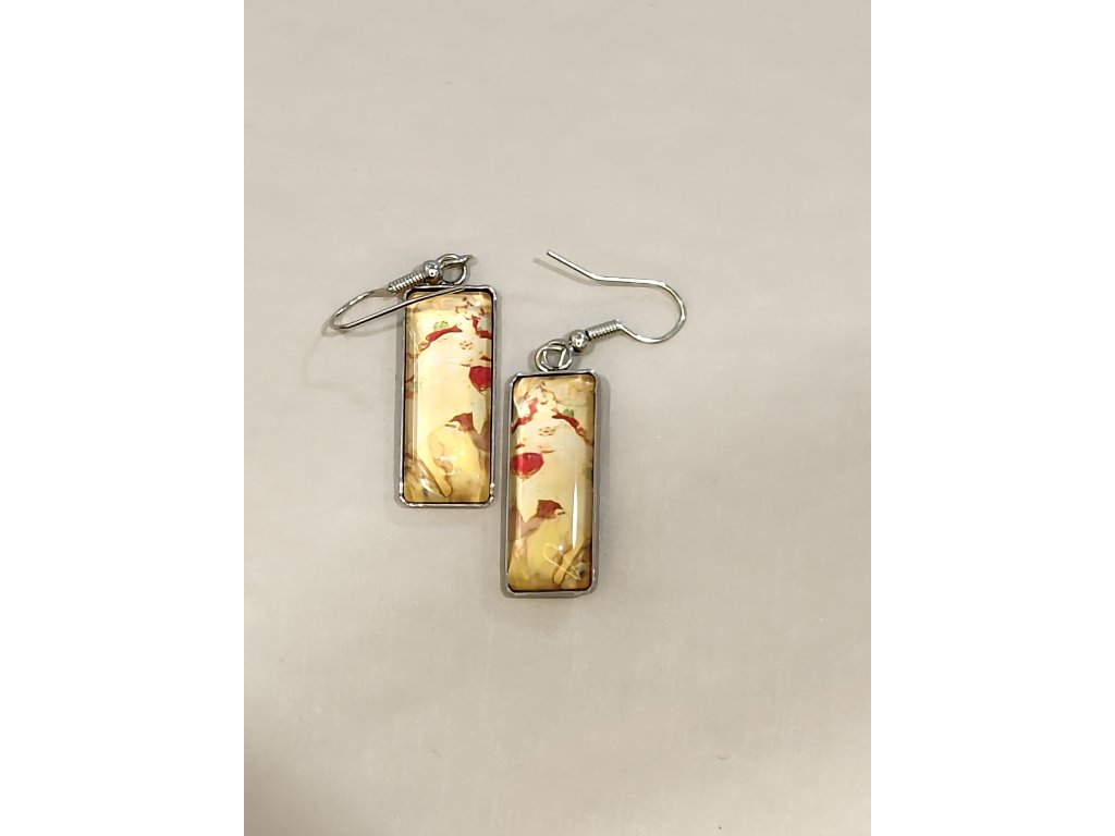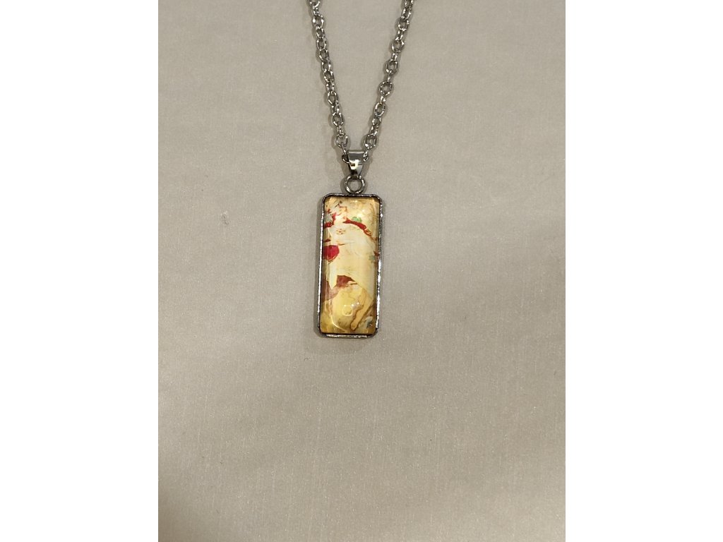 Háčky na náušnicích jsou z nerezové oceli. Řetízek a přívěsek je z bižuterního kovu; přívěsek je zalitý pryskyřicí.