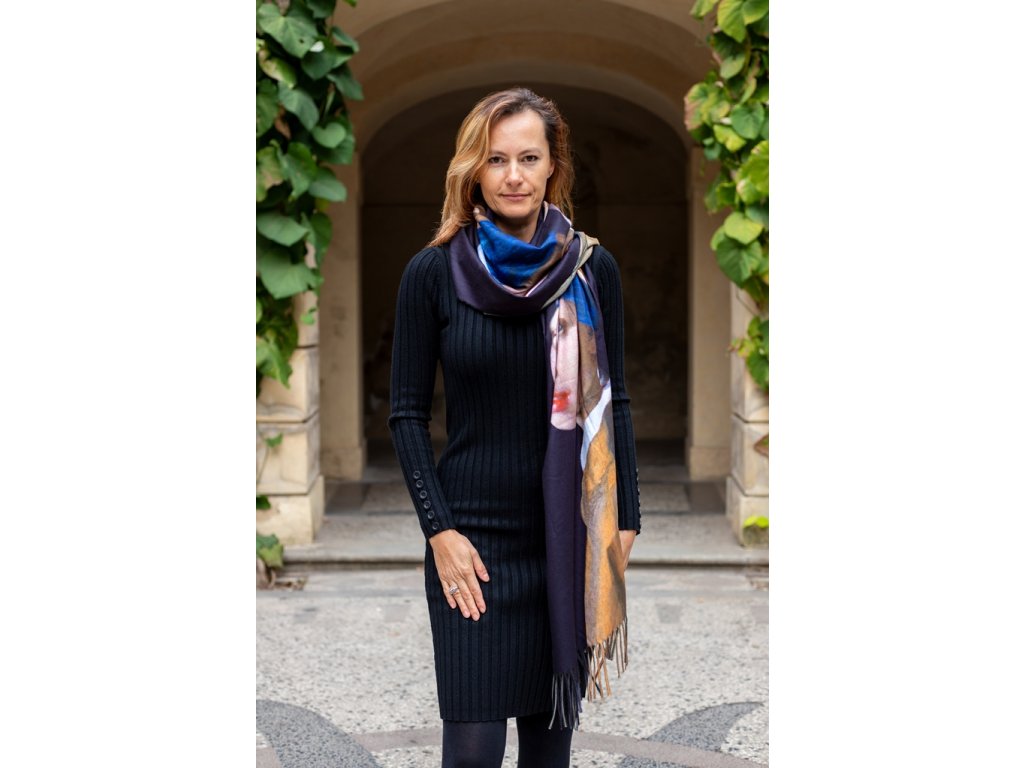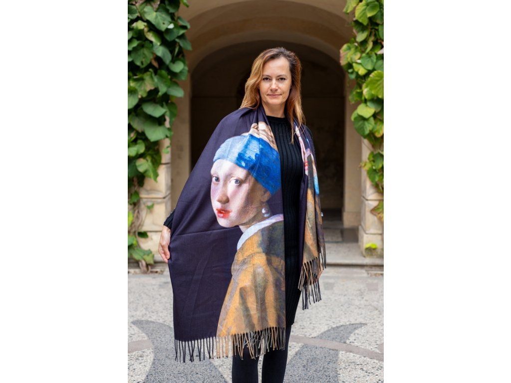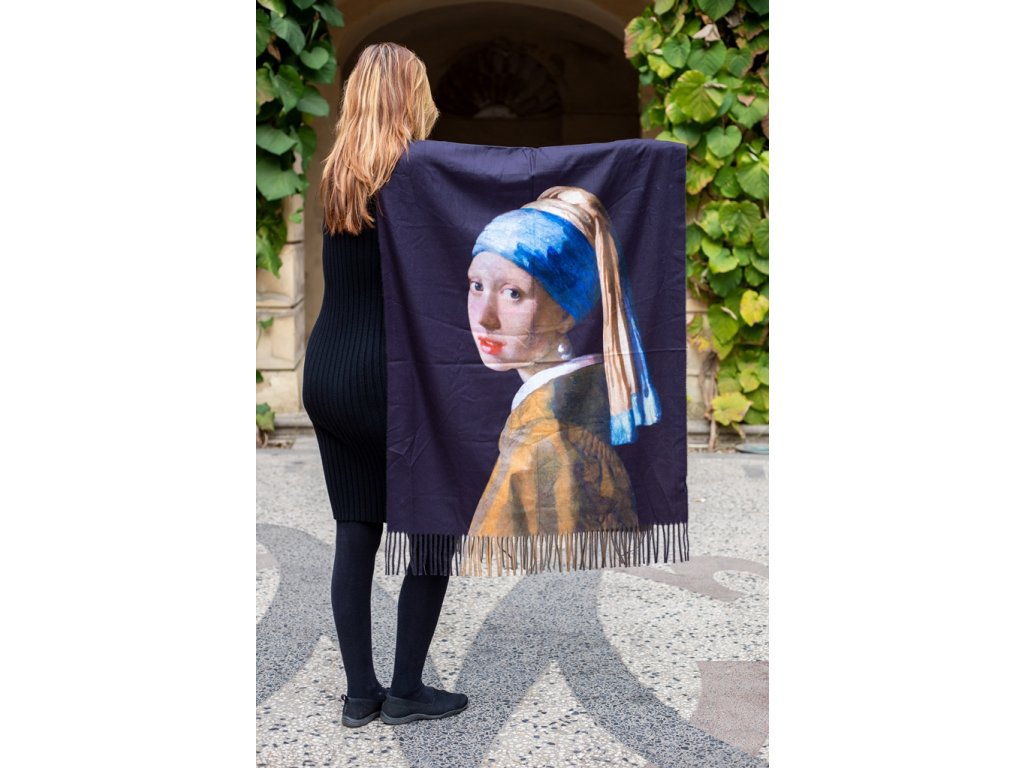 Oboustranná kašmírová šála s obrazem Jana Vermeera - Dívka s perlou. Z druhé strany je obraz Francisco Hayeze - Polibek.