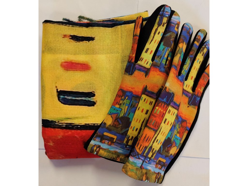 Oboustranná kašmírová šála s obrazem Wasilly Kandinskyho - Mnichovské domy. Z druhé strany je další jeho obraz Studie čtverců.