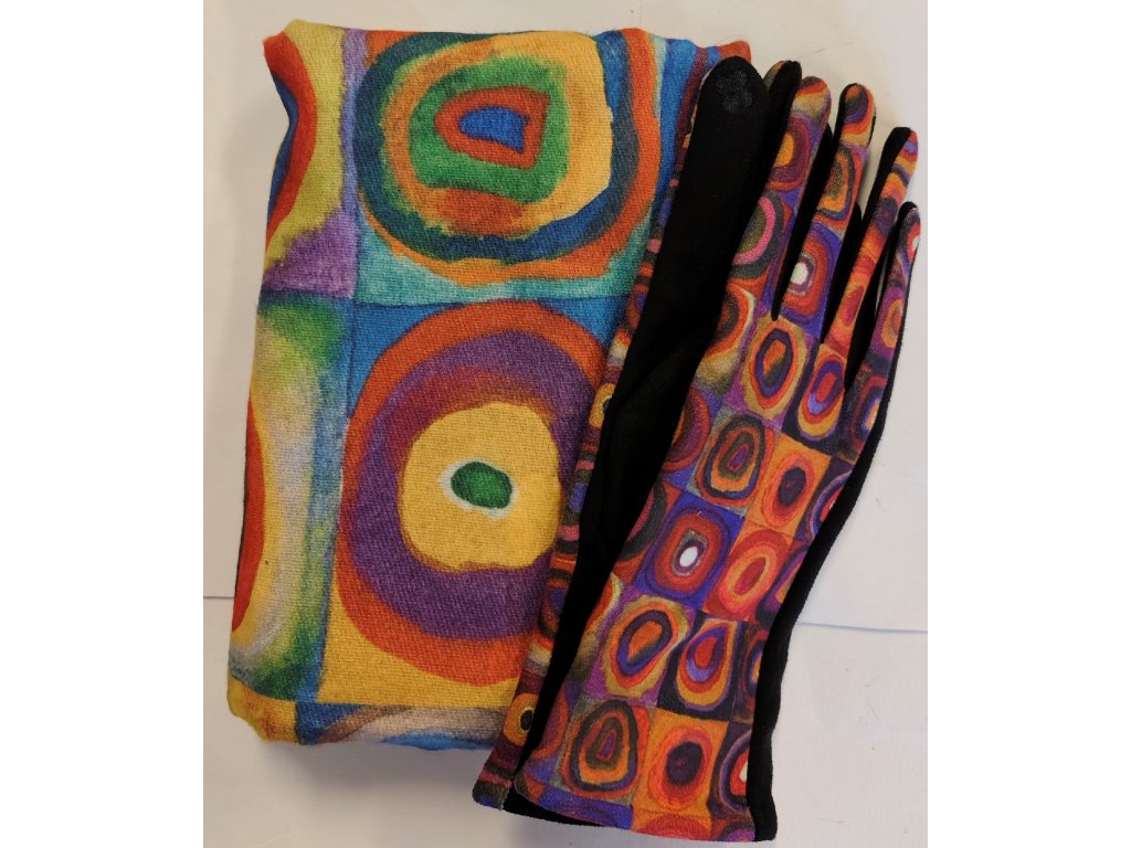 Oboustranná kašmírová šála s obrazem Wasilly Kandinskyho - Studie čtverců. Z druhé strany je variace na Monetovy Lekníny.